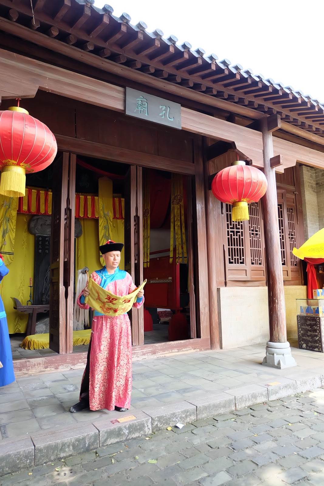 考試過後,還有演員宣達何人中「舉人」。被宣達的兩名遊客還要當場穿起戲服,在孔廟前行祭拜禮儀,隨後「打賞」宣達的兵差。
