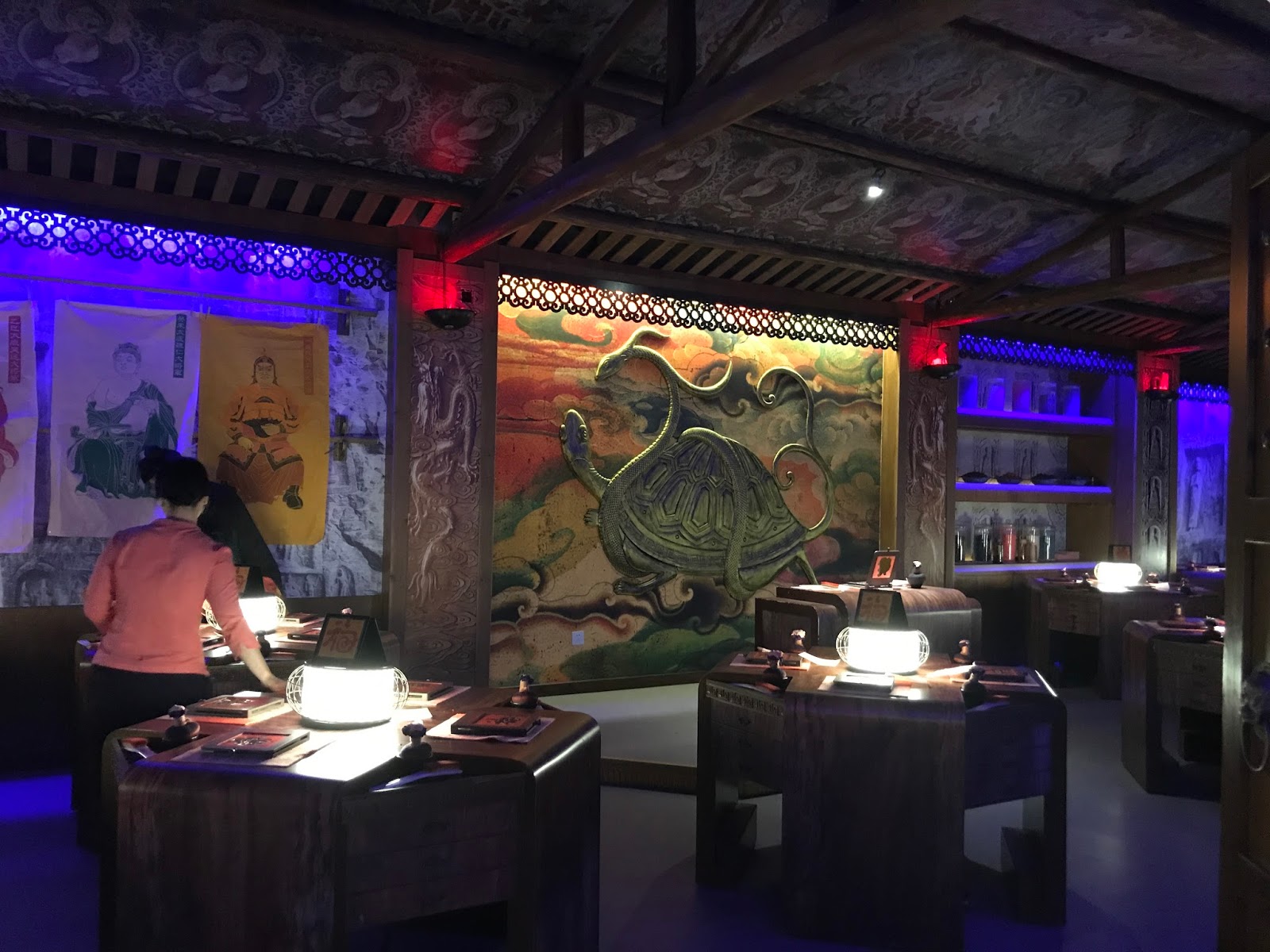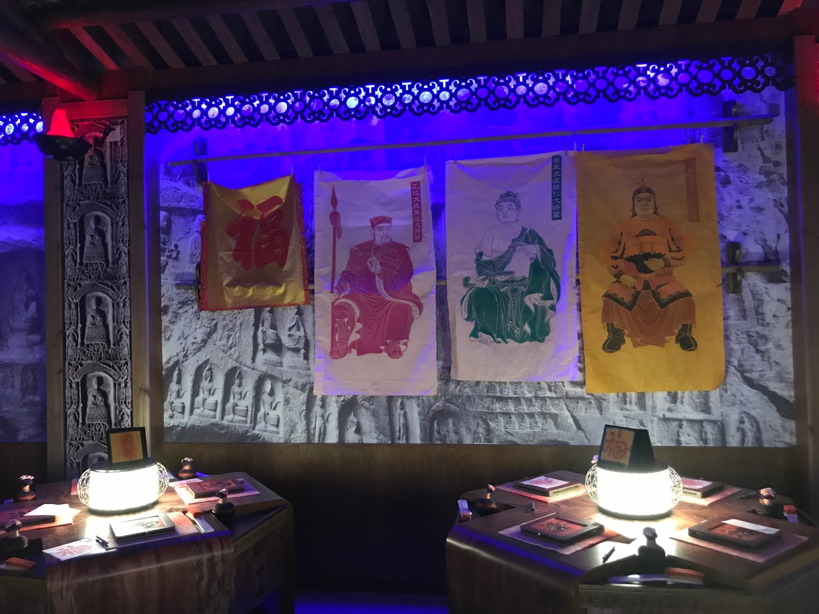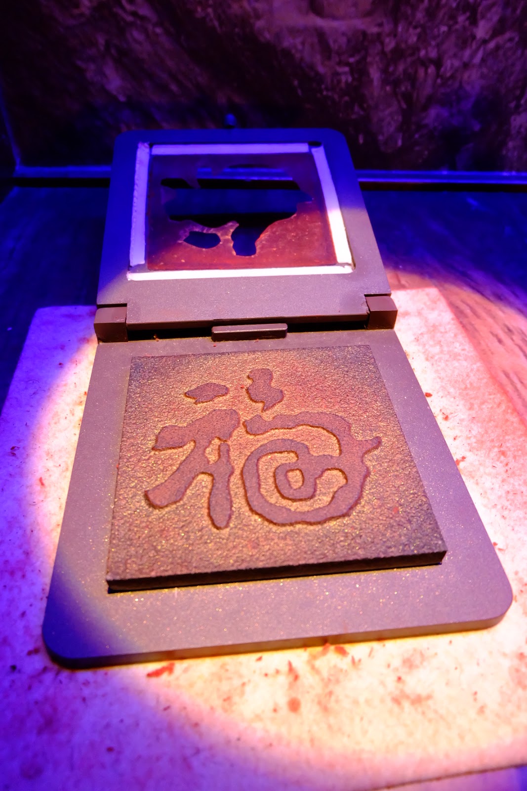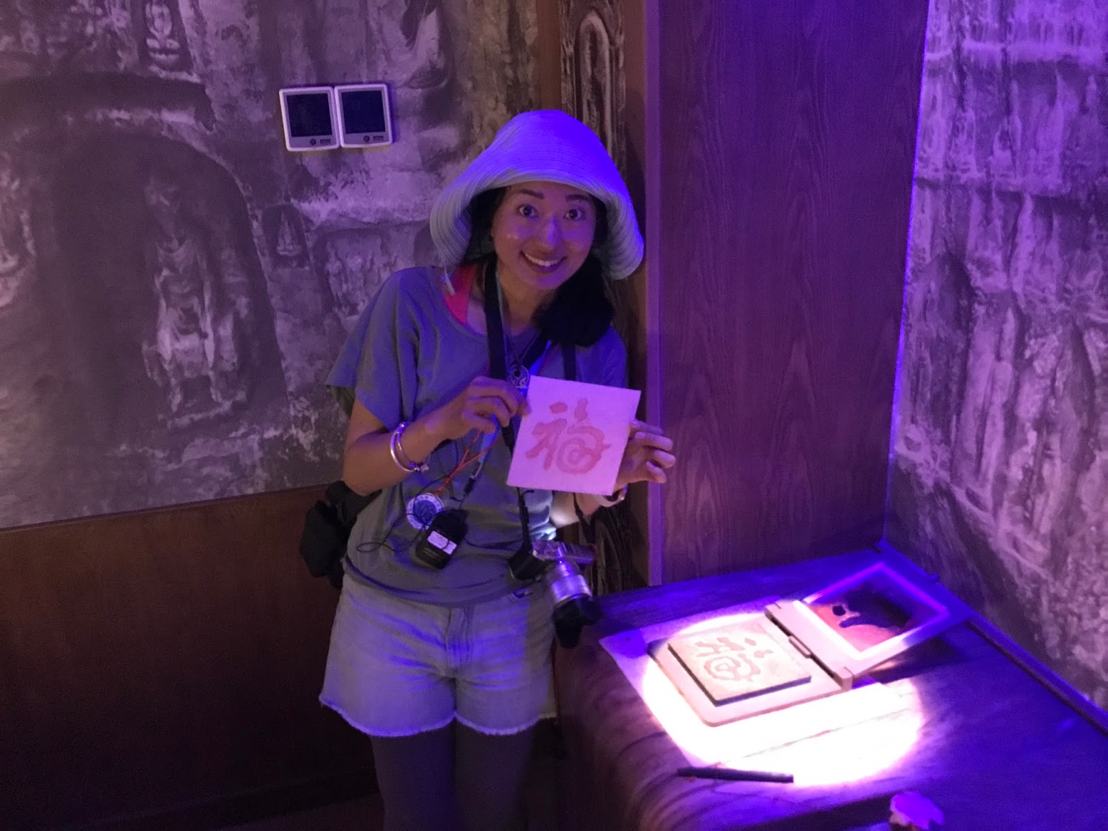 一群人走進拓印區,每個人都有機會拓上一個「福」字。這操作時間抓得很緊,也不給拍照,拓好之後寫上名字,這張福字就留在桌面上,工作人員會拿到外面去晾乾。我們匆匆地拍了一張照片,後來才知道遊客的作品被統一拿到外面裱框,凡是要拍照或是將福字帶回家的人,要付點錢才能拍照或帶走。