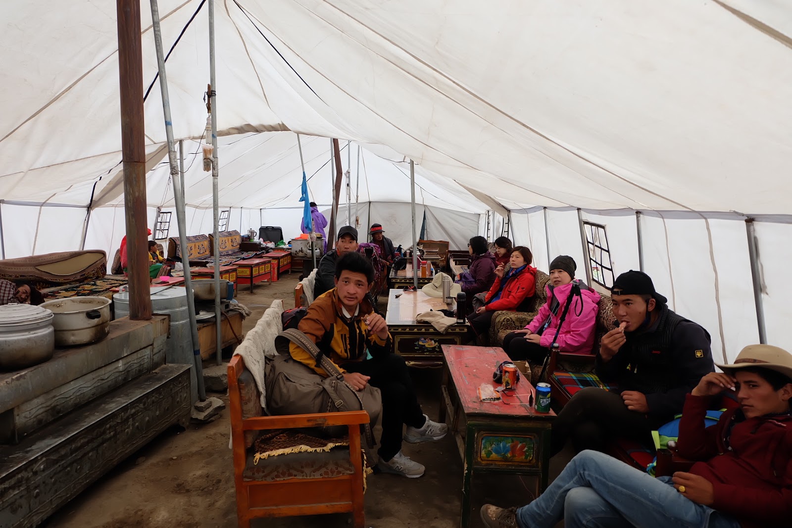 第二個茶館,第二次大休息。我們大夥兒才剛進帳篷坐下來,外面就下起傾盆大雨,還交雜著轟隆隆的打雷聲。老天真是眷顧我們,沒有讓我們在大雨中徒步前進。在帳棚裡休息了半小時多,等雨變小之後,我們再繼續往前走。