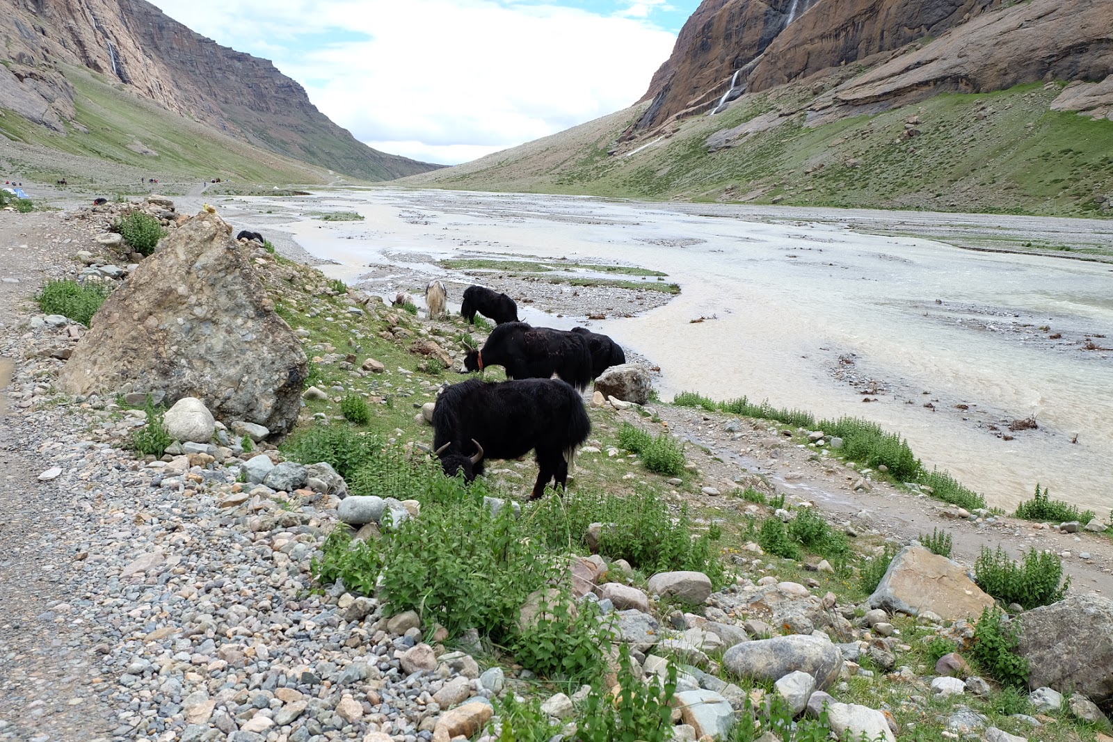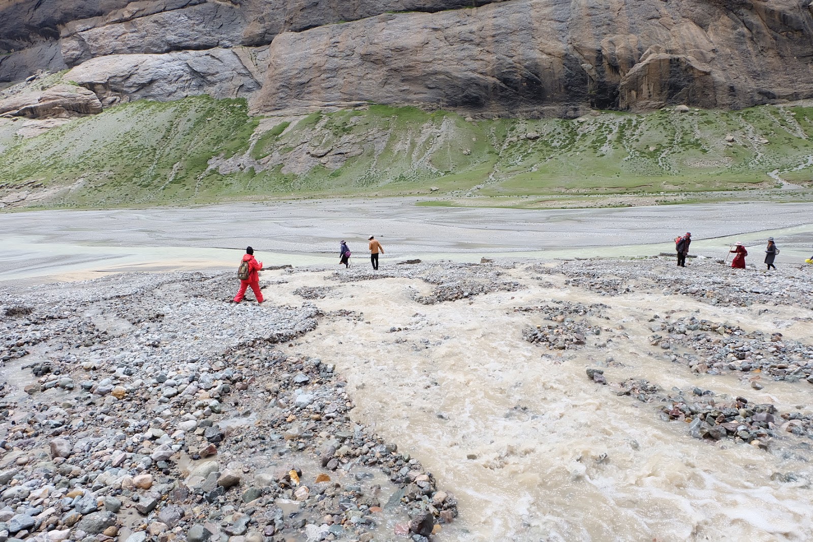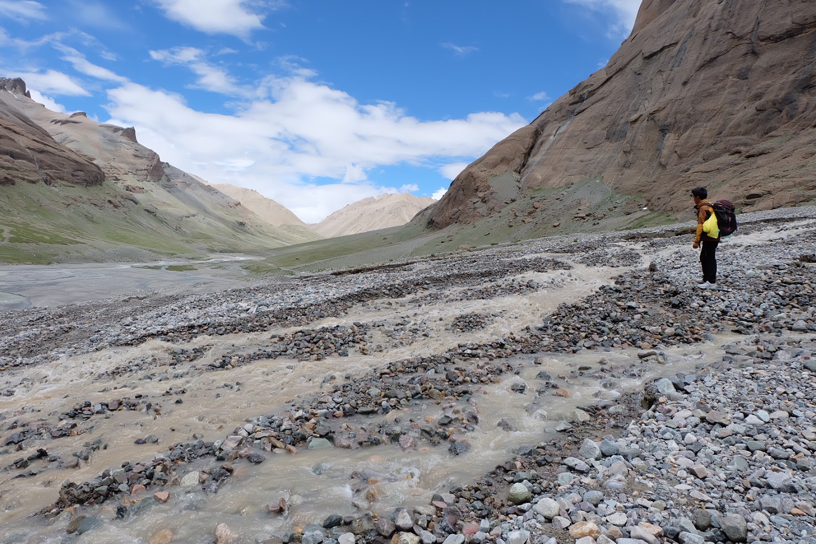 沿途的山路,因為夏天雨季水量豐沛,滿溢出來的雨水和融化的雪水從兩旁的山谷縫隙中沖刷到主河谷的沿岸緩坡,橫截我們的山路。部分水流相當湍急,站在這奔流到河谷的溪水旁,還得小心翼翼地找路,避免自己掉到水裡。