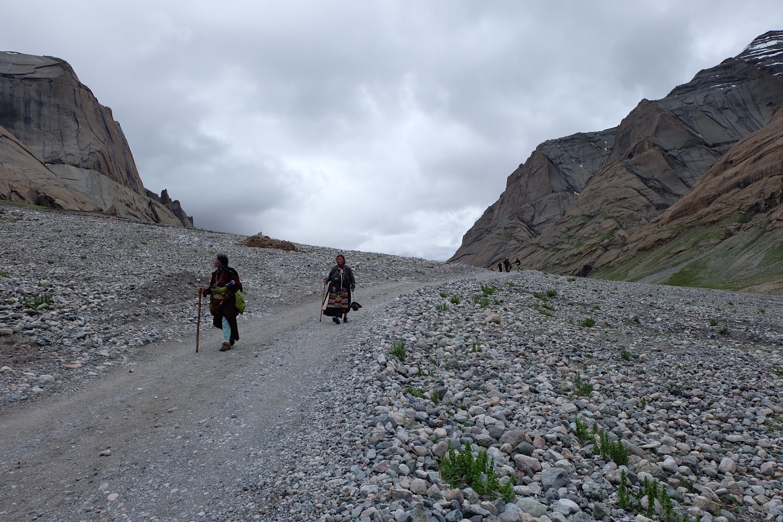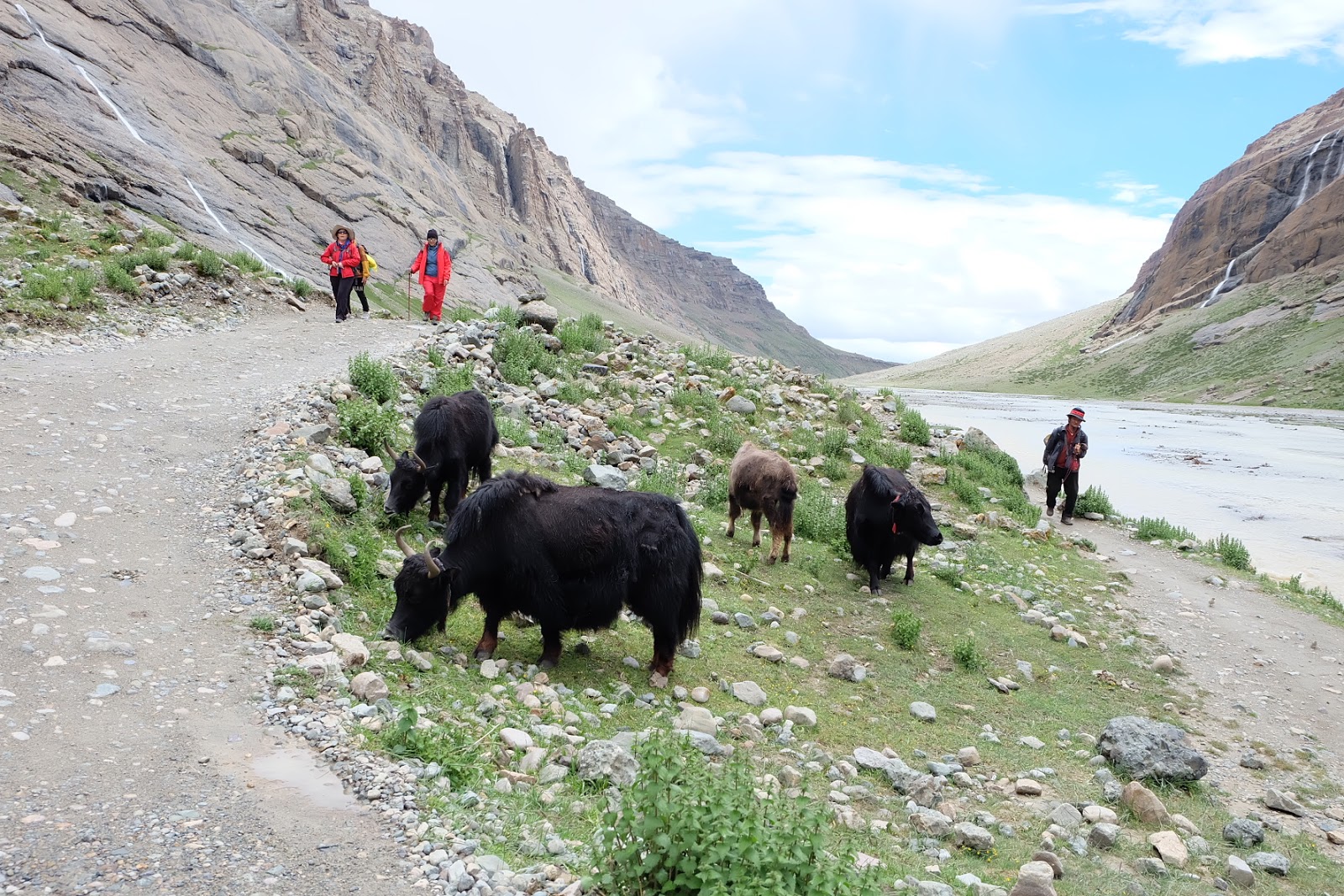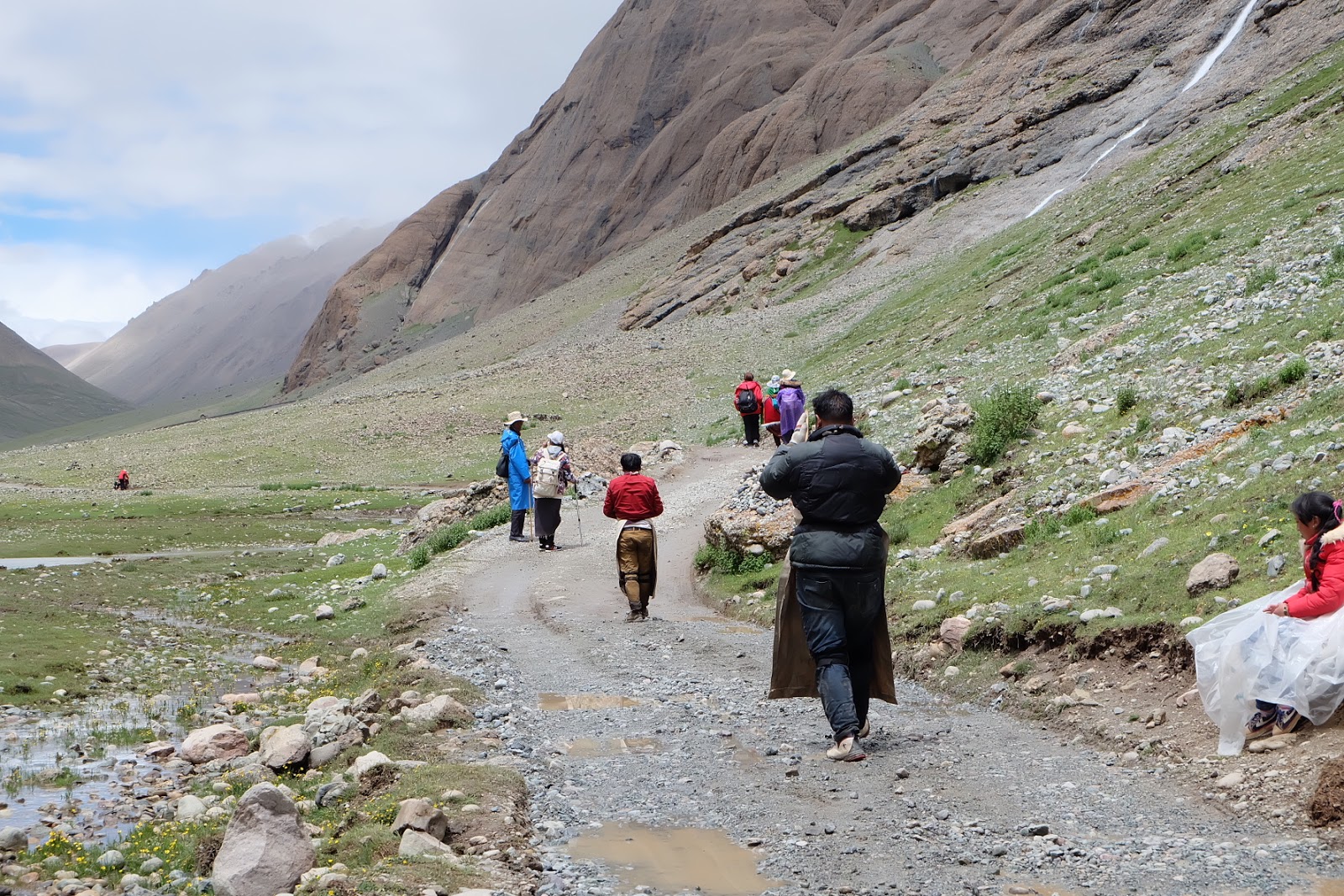 沿途的山路,因為夏天雨季水量豐沛,滿溢出來的雨水和融化的雪水從兩旁的山谷縫隙中沖刷到主河谷的沿岸緩坡,橫截我們的山路。部分水流相當湍急,站在這奔流到河谷的溪水旁,還得小心翼翼地找路,避免自己掉到水裡。
