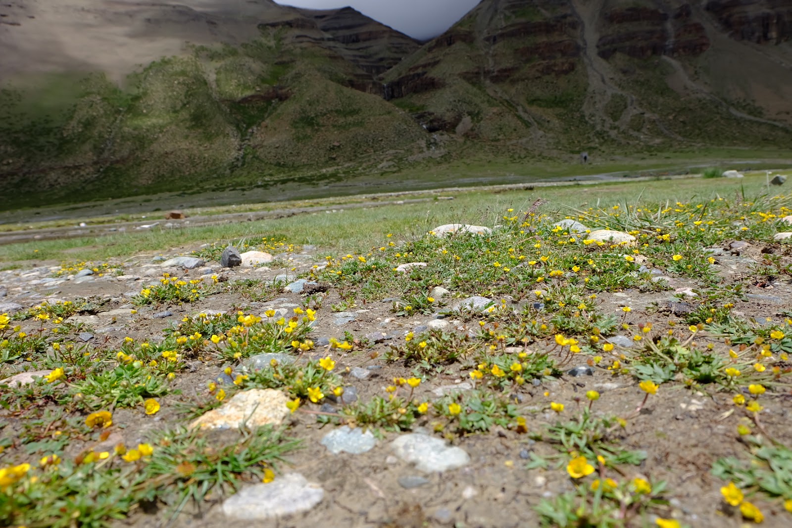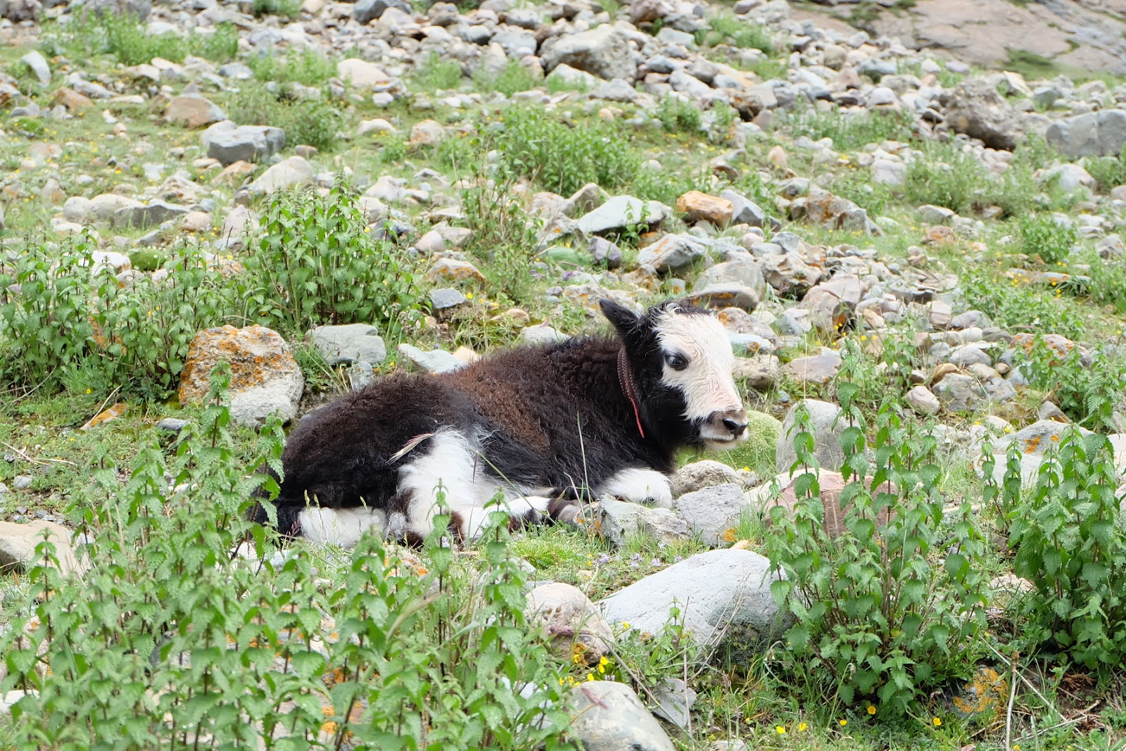 夏天是雨季,水量豐沛,沿岸的緩坡上,撲滿鮮綠色的草地,到處長著許多不知名的小花。這裡海拔近5000公尺了,所以植披都相當低矮。