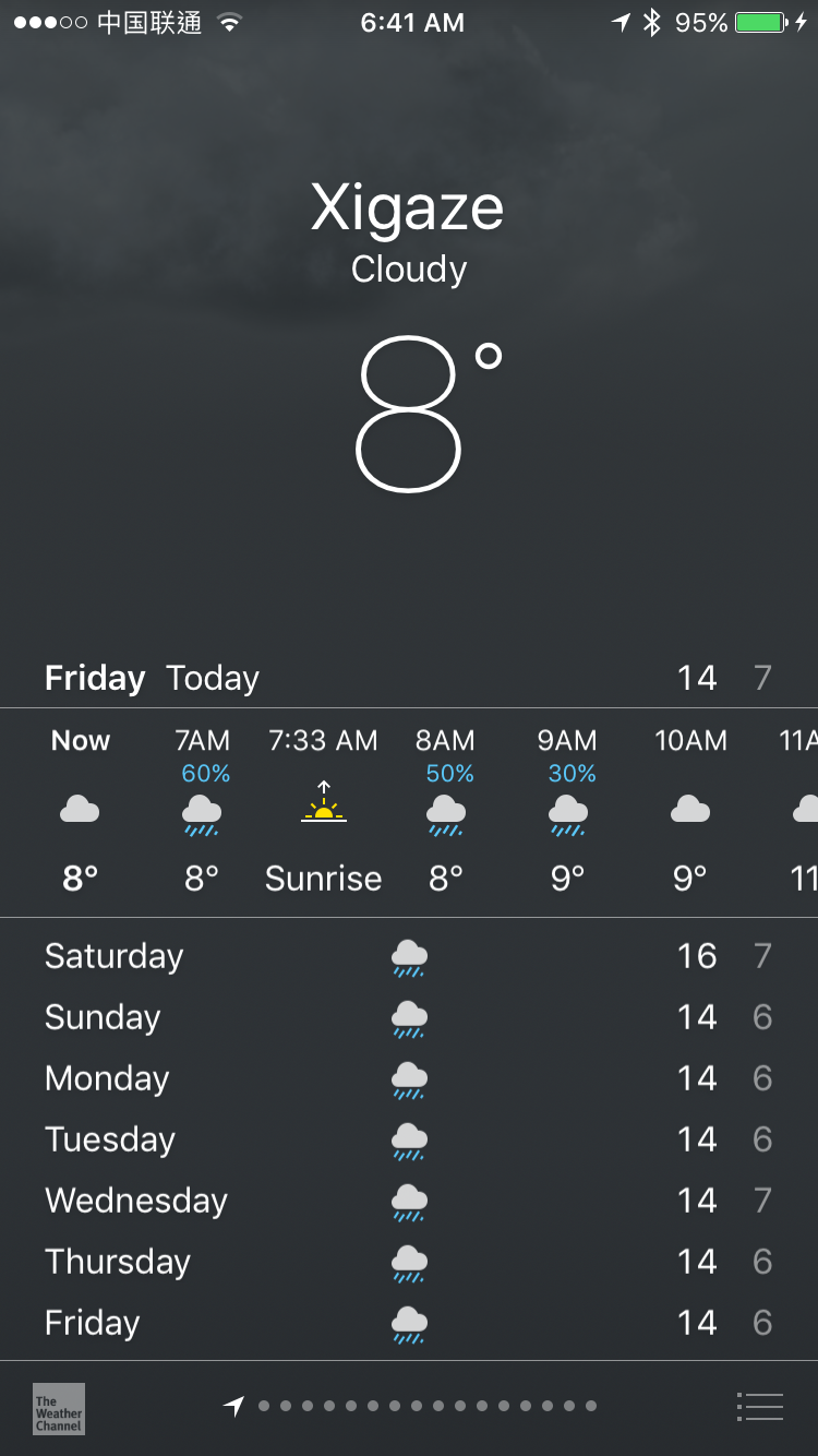 早上6:40,外面氣溫約8度,但不覺得很冷。這個Weather APP是連結到整個日喀則區(Xigaze)的氣溫,日喀則區範圍非常大,有山區,有谷地,這個Weather APP其實有點失準,我想就拿參考用吧。