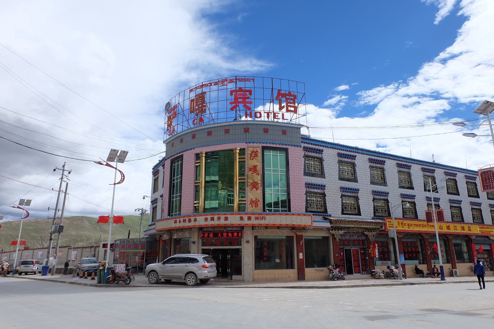 下午五點多,抵達薩嘎。日曬正強。這是我們下榻的薩嘎賓館。