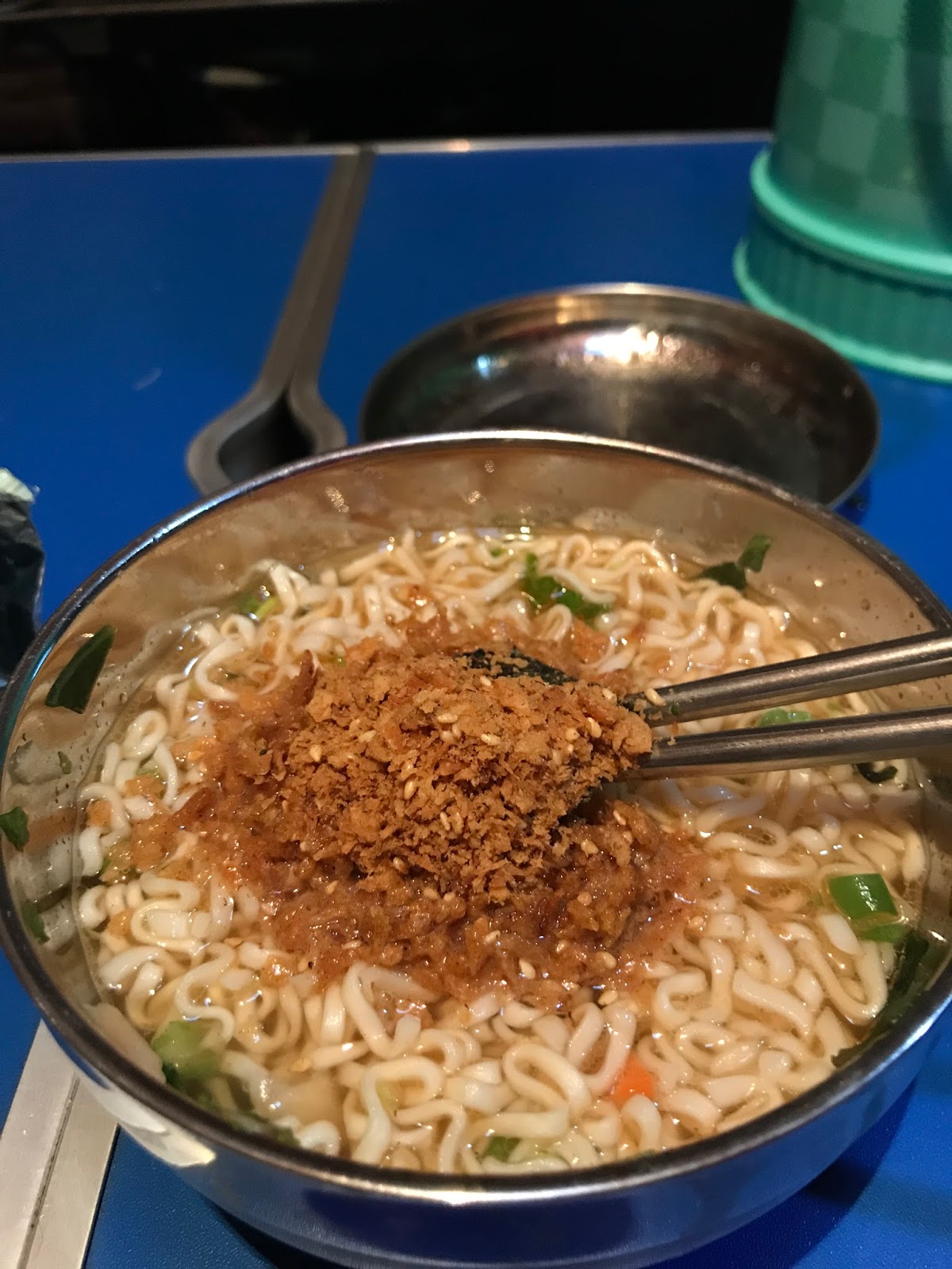 話說,我的晚餐,就是一碗泡麵,配上自己帶來的素肉鬆。