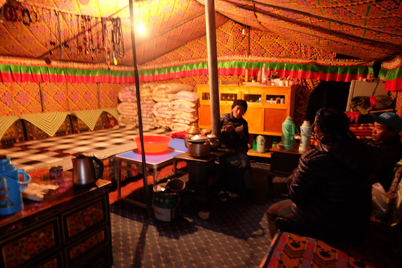 經營帳篷的人都是藏族,擺設都是藏式擺設。這是一個長方形的帳篷,中間一定是爐子,左邊整排是睡鋪,右邊有長椅子,也可以睡覺用。一個晚上一個床位是RMB100。正中間的後方,就是大寶法王的照片,照片下方放了七杯水,做水供,一旁還有酥油燈。