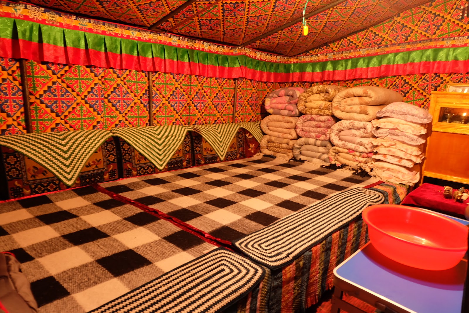 這天晚上司機先生劉師傅就睡在車上。我看著店家幫忙拿床鋪和棉被,鋪在遊覽車的走道上,讓劉師傅可以平躺著休息一晚。我們想外面天氣那麼冷,即使是夏夜,這石礫山谷區的溫度也是在五度上下,頗冷。劉師傅對這樣的安排看起來習以為常,我們邀請劉師傅一起來帳篷打地鋪,劉師傅和導遊都拒絕了。他們低調地表示,景區規定很嚴格,這是不可以的。