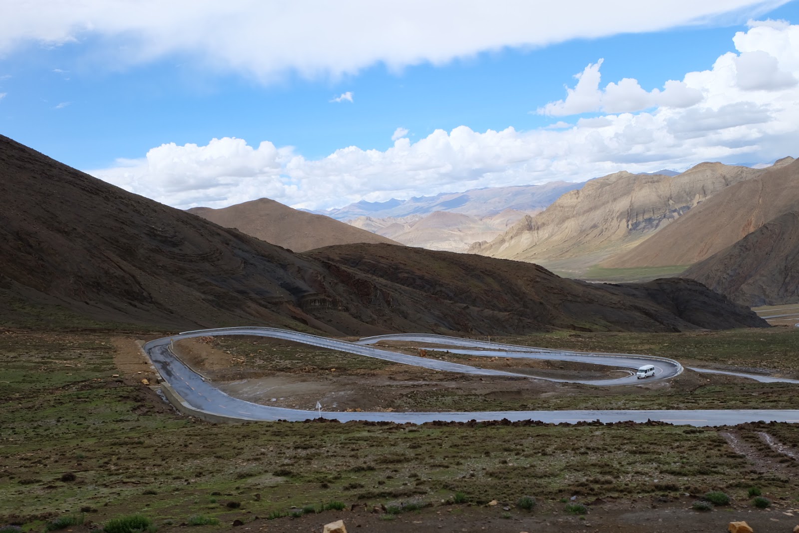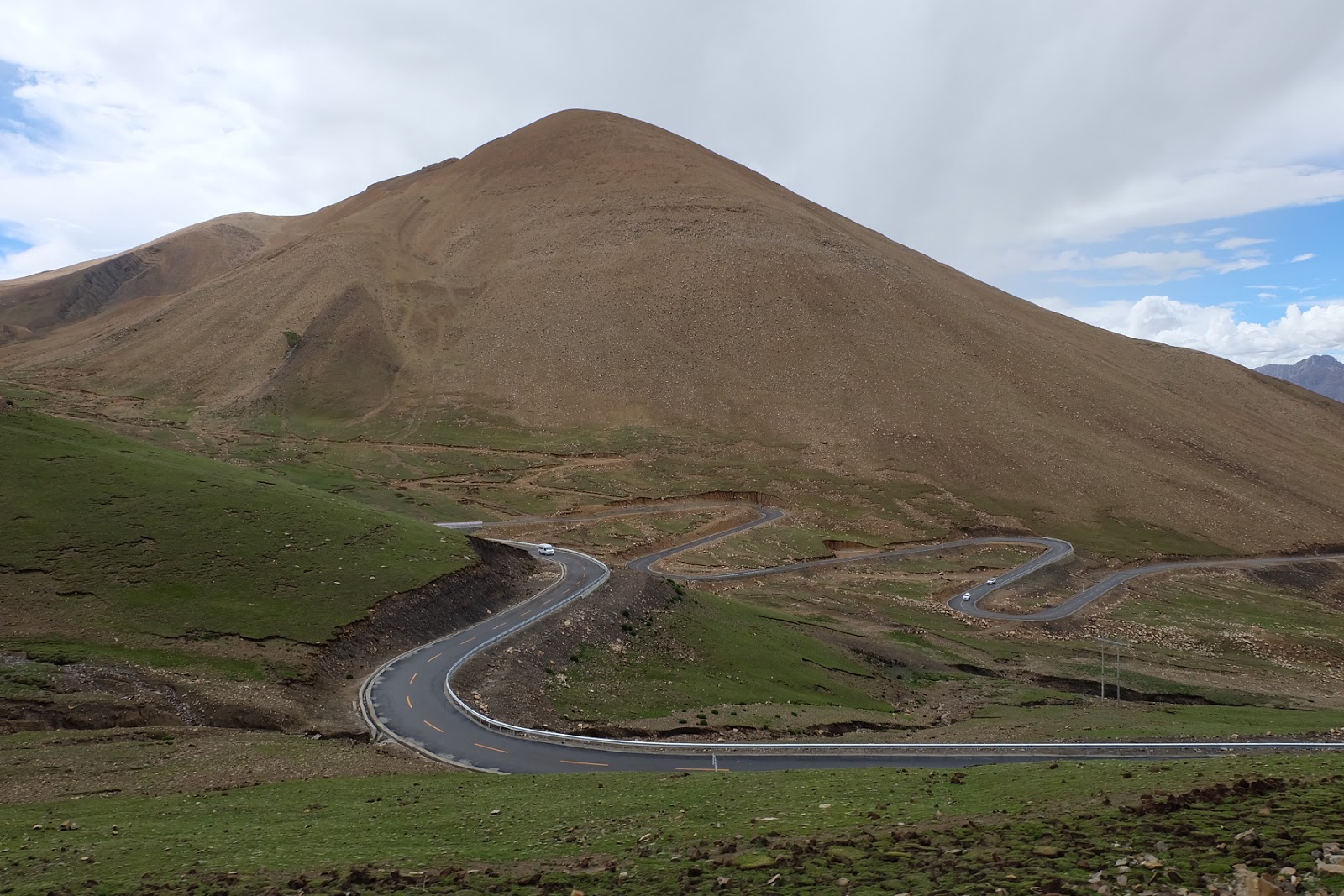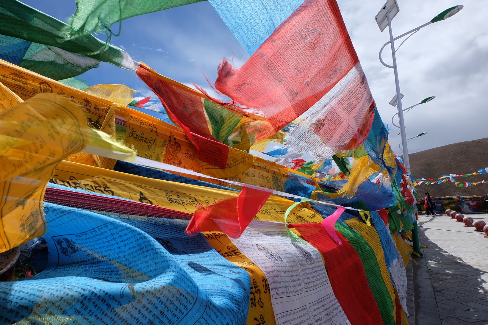 車子越往山區走,兩旁的山景開始變化,山的顏色開始不一樣。唯一不變的是,每到一個山口,山頂處都會掛滿彩色的五彩經幡,在風中飄揚。藏人們過山口的時候,都會高聲大喊:「拉颼颼~~~歐~~~」。