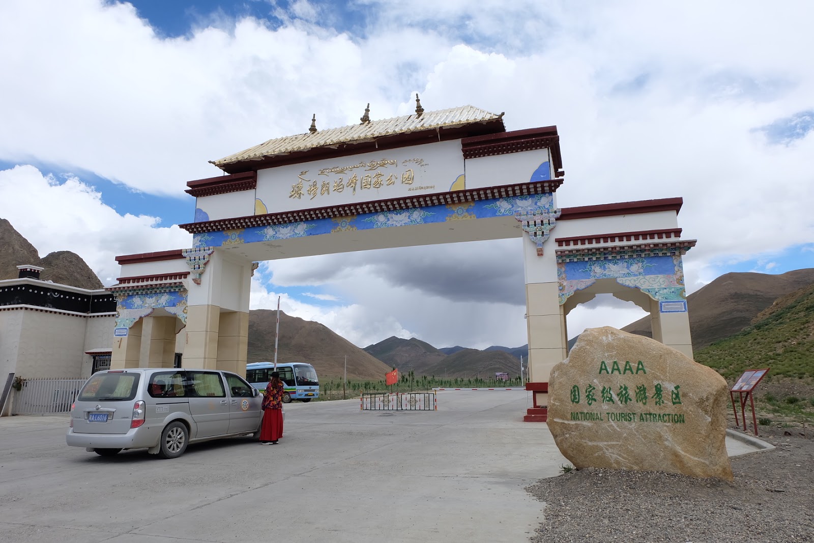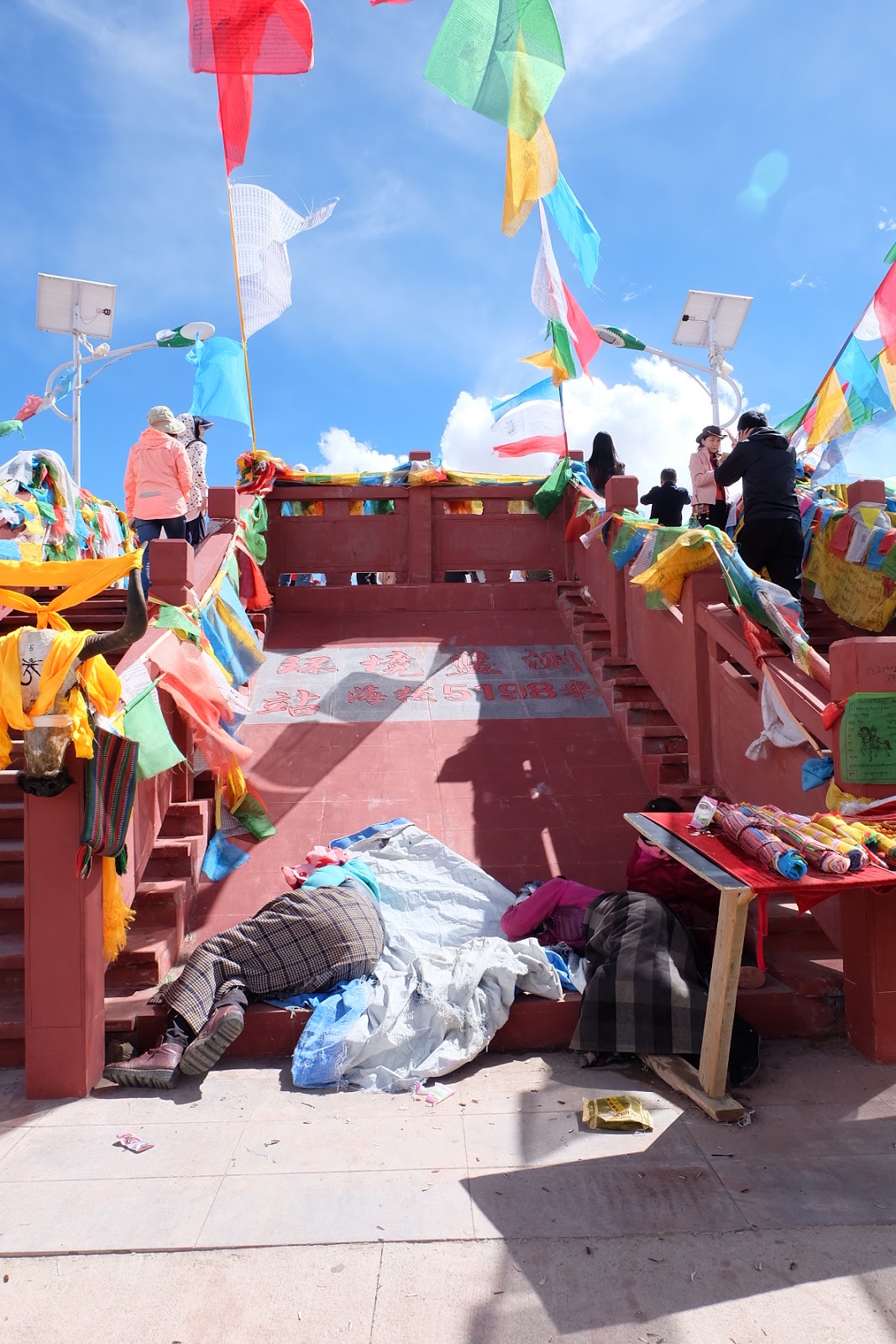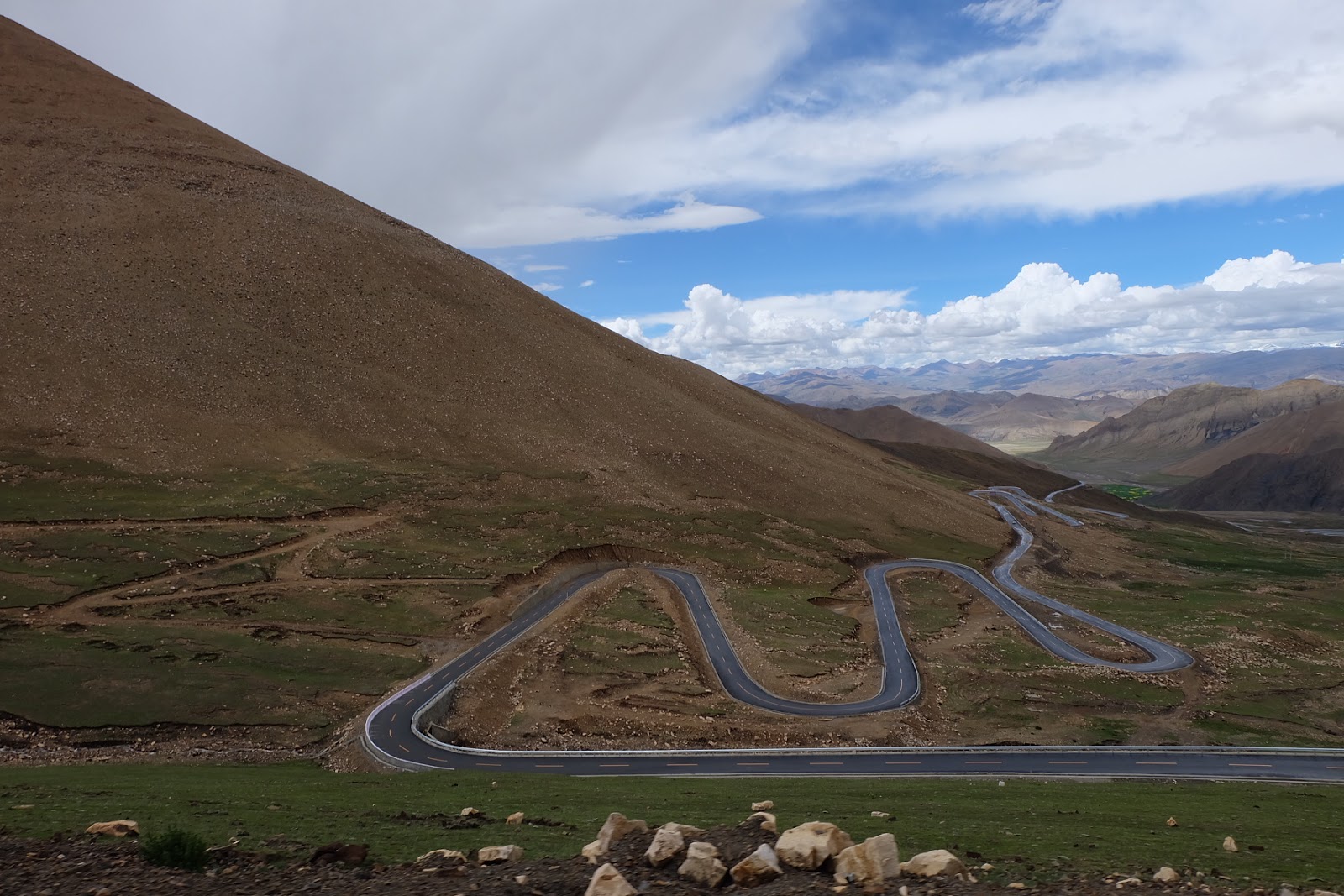 車子越往山區走,兩旁的山景開始變化,山的顏色開始不一樣。唯一不變的是,每到一個山口,山頂處都會掛滿彩色的五彩經幡,在風中飄揚。藏人們過山口的時候,都會高聲大喊:「拉颼颼~~~歐~~~」。
