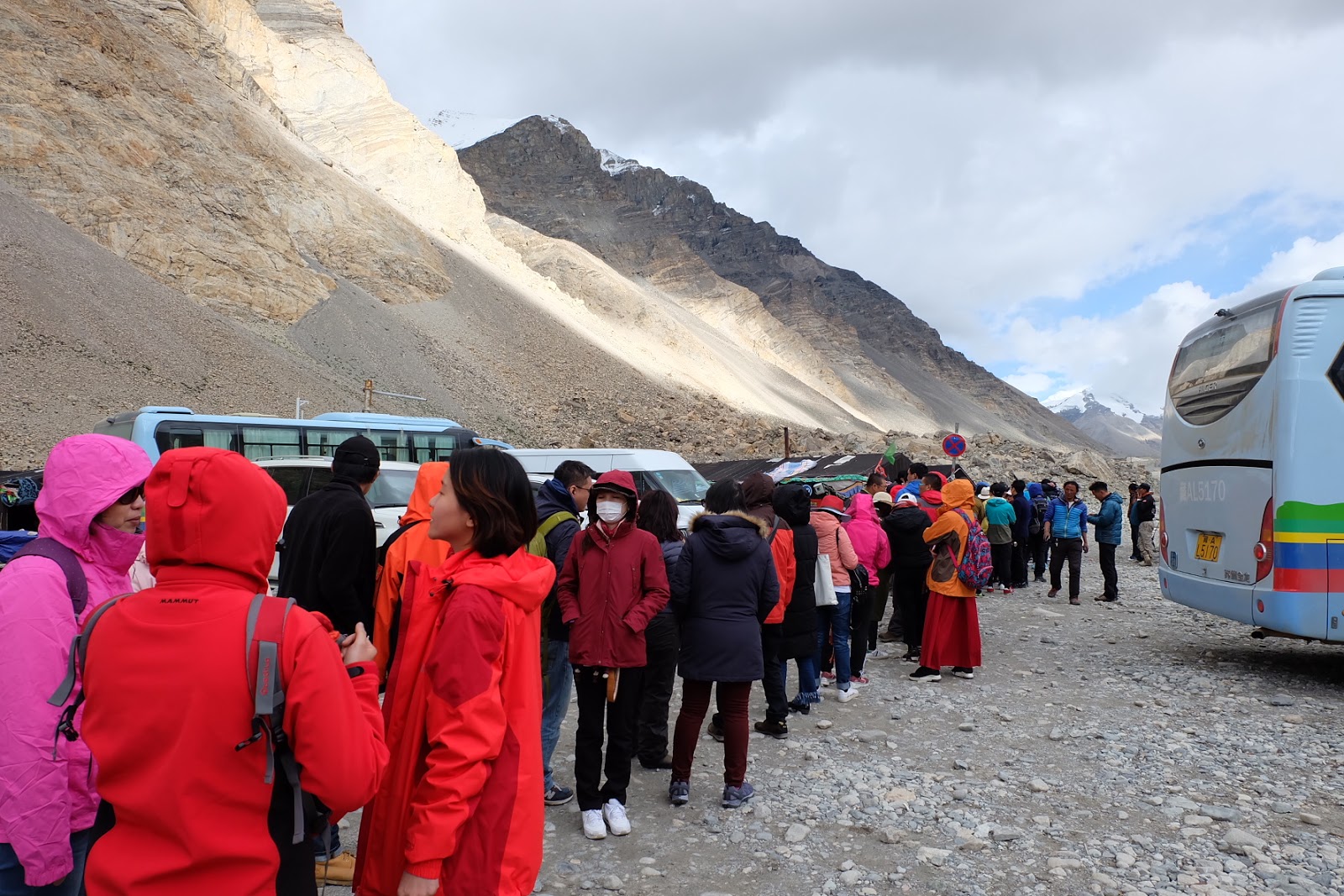 我們在晚上七點抵達帳篷區,趕緊去排隊做環保車前往珠峰大本營膜拜世界第一高峰。進入珠峰風景區的門票要價RMB180,環保車要RMB25。晚上八點,安檢人員會把所有遊客驅離大本營,我們時間有限,要抓緊時間。