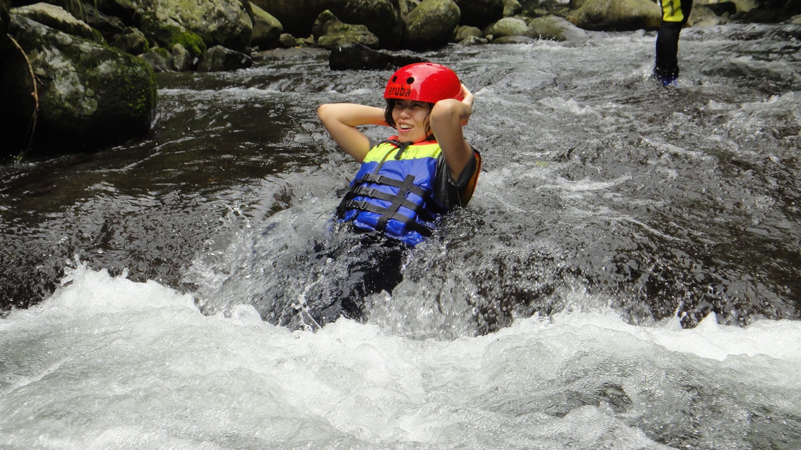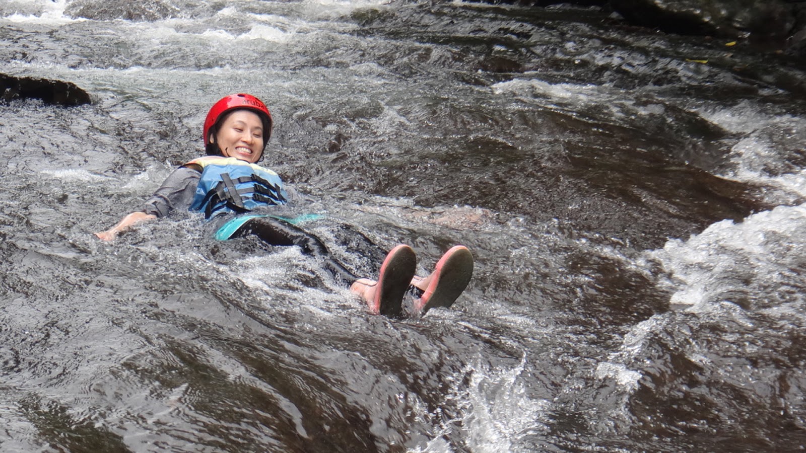 - 在乾淨的溪水中行走要很專心,因為腳底下的石頭凹凸不平外,水流還會把人往下沖。不過溪谷兩岸都有樹蔭,微風緩緩吹來,怡人沁心!