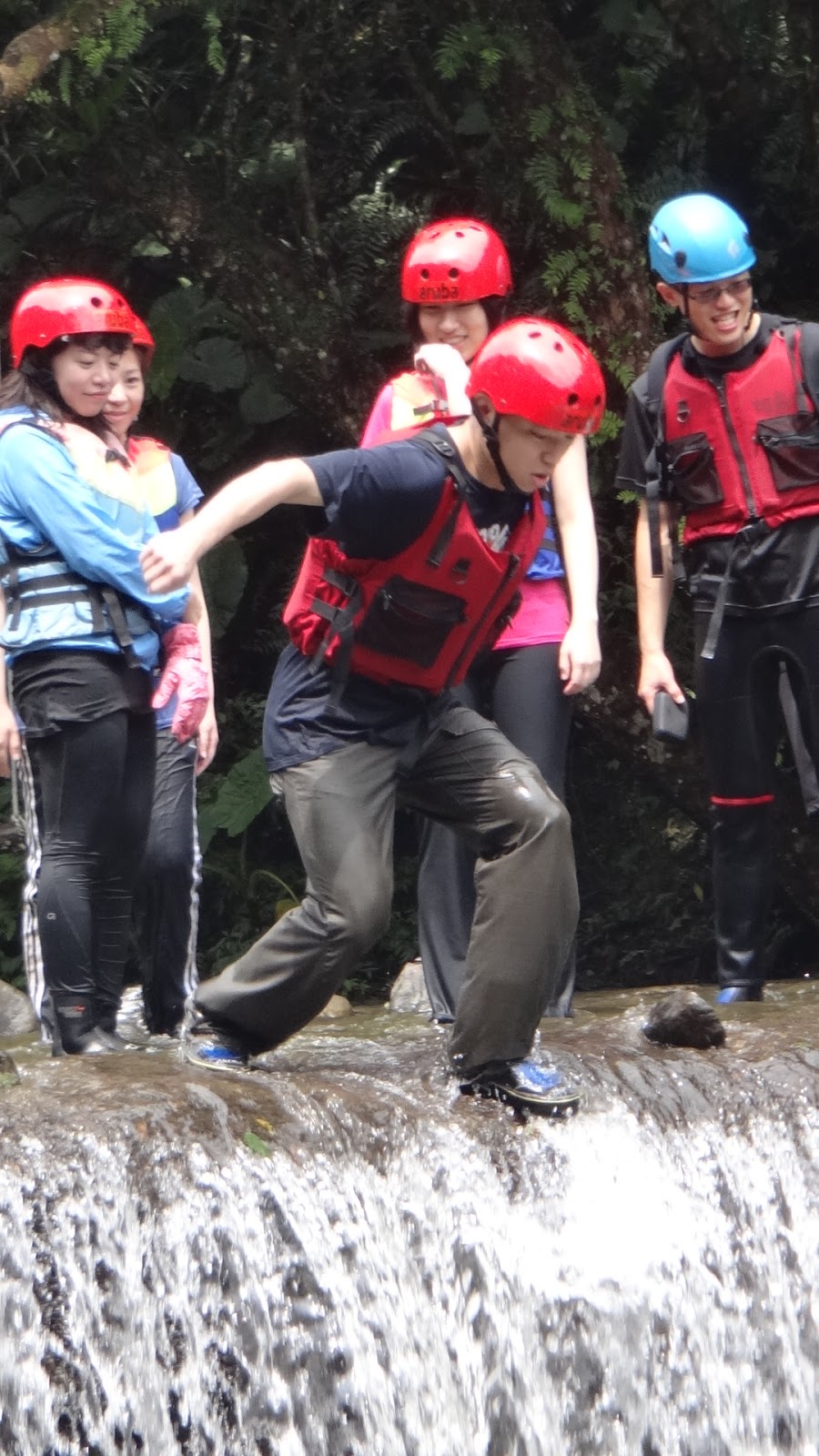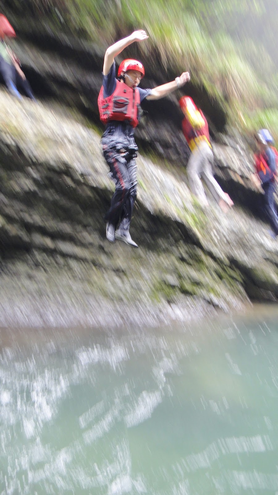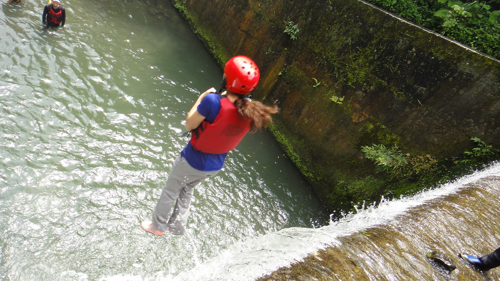 - 我們有兩次跳水,一次是攔沙壩,一次是岩石上。在攔砂壩邊緣,只要把腳跨出去,整個身體就懸空往下掉了;但是在岩石邊緣,因為石頭有突出,不只是把腳跨出去,還要稍微往前跳一下,否則會撞到石頭呢!