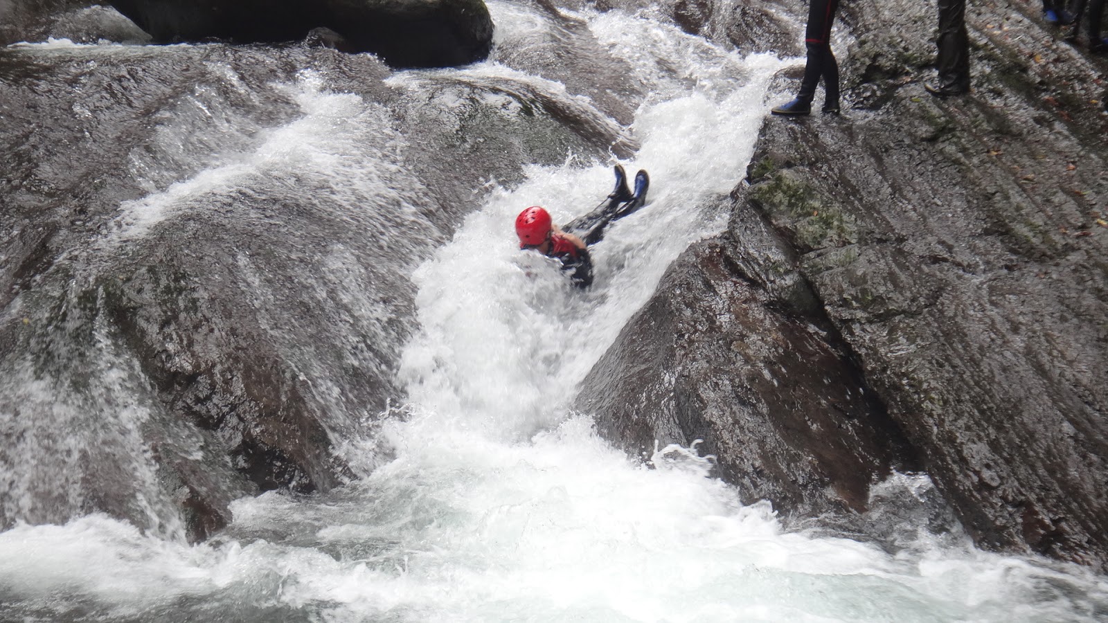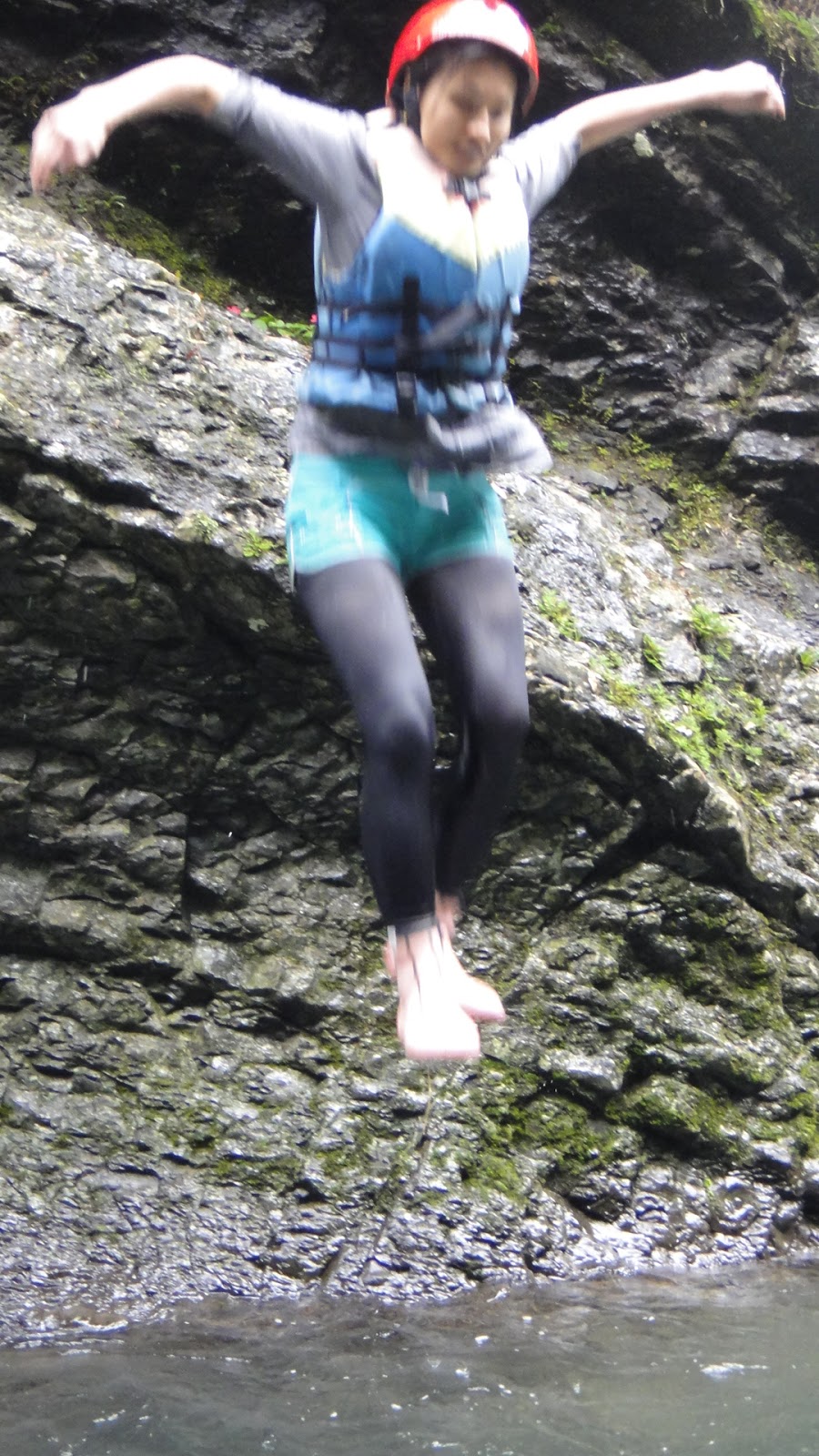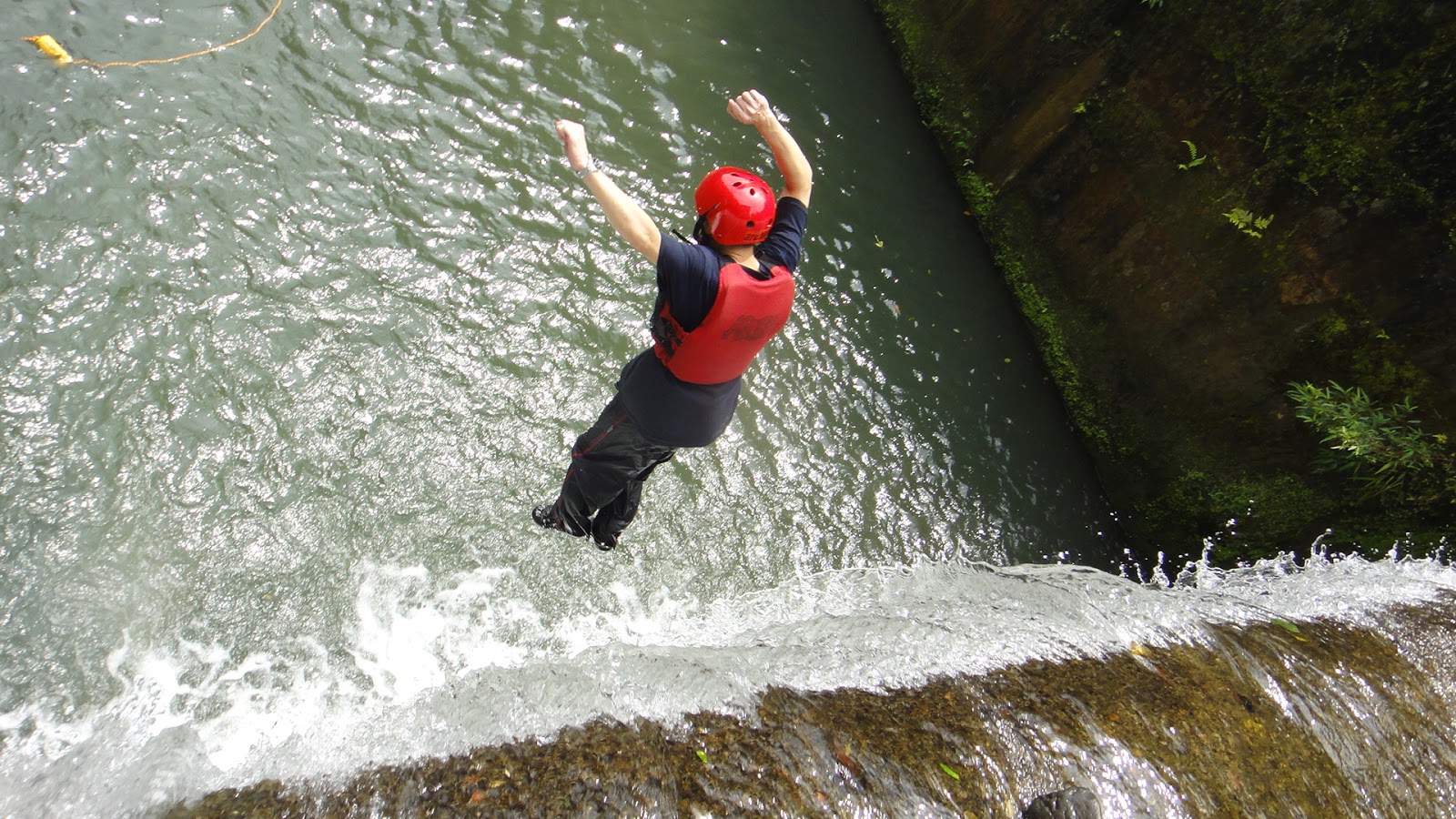 - 我們有兩次跳水,一次是攔沙壩,一次是岩石上。在攔砂壩邊緣,只要把腳跨出去,整個身體就懸空往下掉了;但是在岩石邊緣,因為石頭有突出,不只是把腳跨出去,還要稍微往前跳一下,否則會撞到石頭呢!
