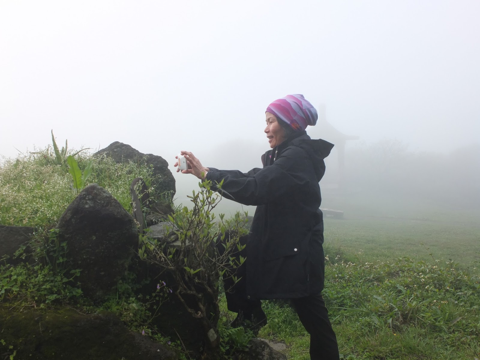 抵達小油坑休息站的時候,約十二點多。從七星山一路往下走,濕氣越來越重,石頭路越來越滑,人龍越拉越長。下雨路滑。石頭路在下雨天比泥土路還難走倒是真的。