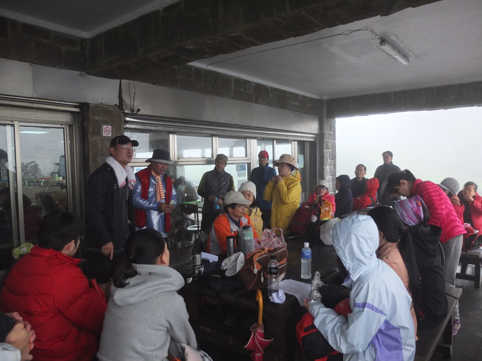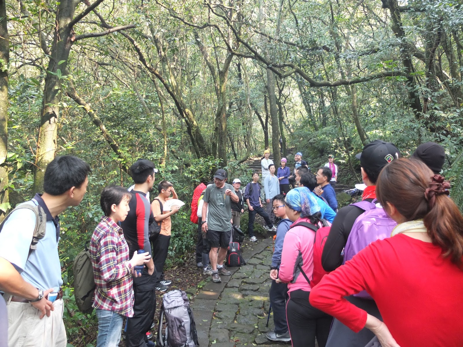 下圖途中墨綠衣服、藍帽子的人,就是第三個嚮導 – 號稱「二哥」的林先生。二哥背了一個大背包,裏面裝了很多寶貝,期待等一下中午大家用餐的時候,二哥把寶貝們都掏出來跟大家分享。這時候,走累了,二哥正在分享登山注意事項。瞧大家聽得入神!
