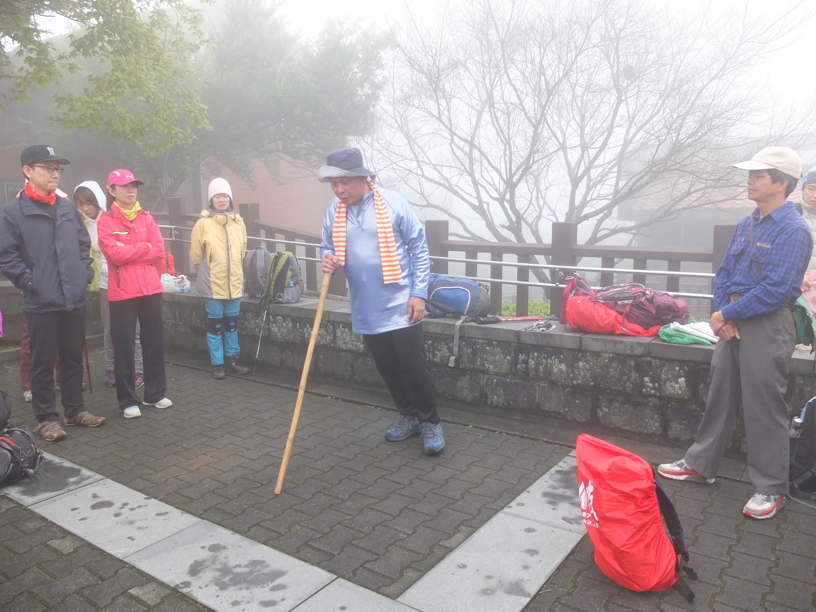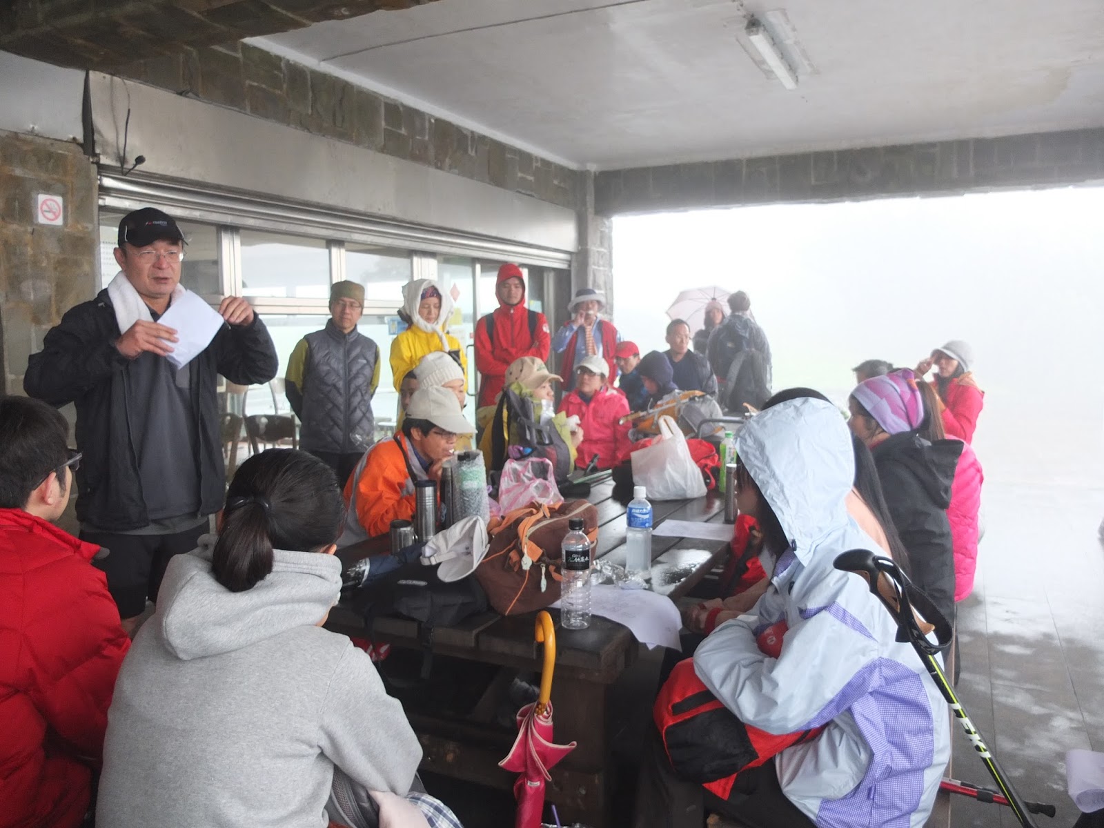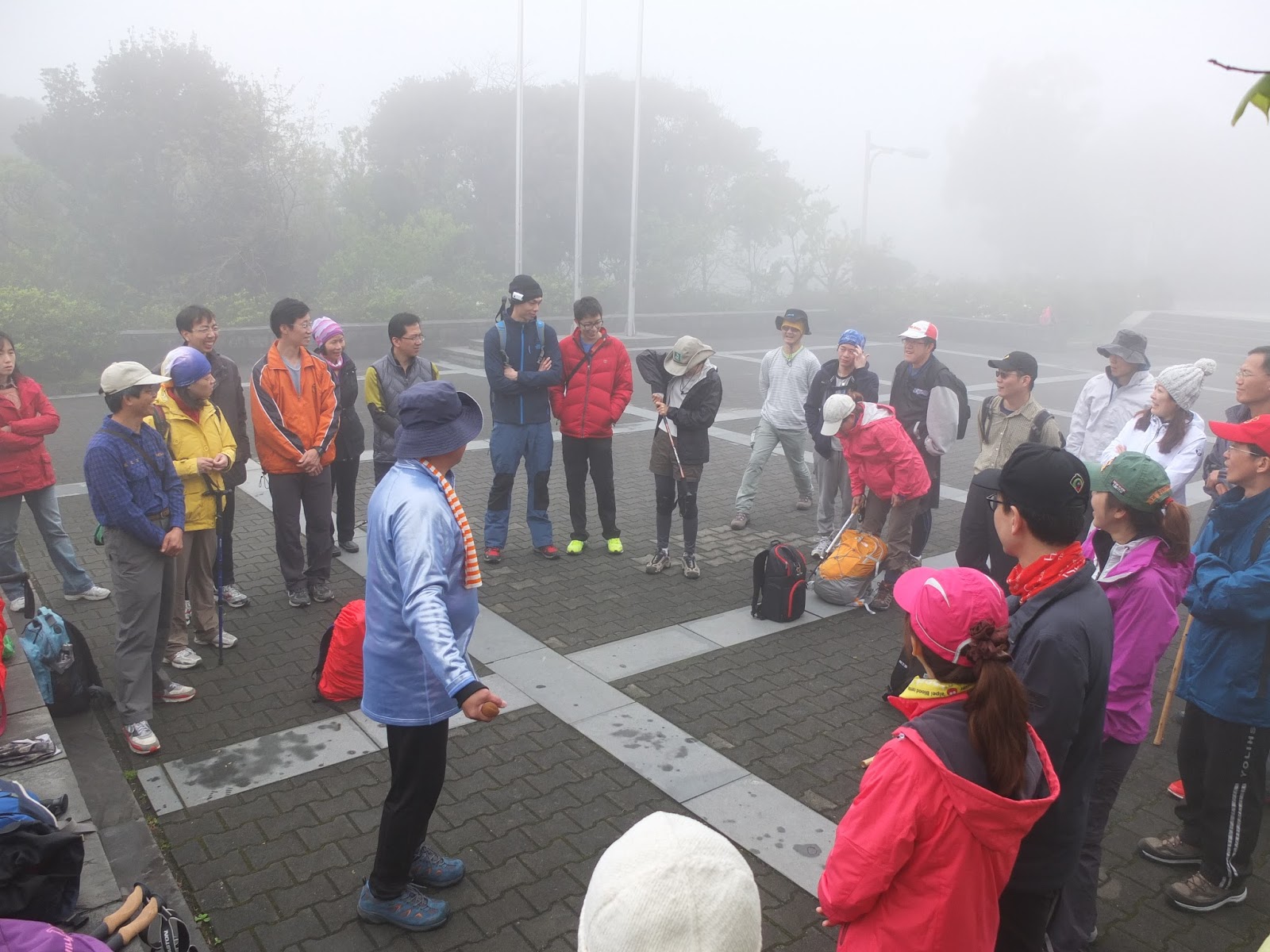 八點半,我們請登山界前輩中的前輩 – 施大哥,為大家介紹登山裝備。大夥兒一起聚集在遊客中心前的廣場,聽老師幽默地講解如何使用登山杖,以及天候變化時,衣物的準備,以及認識機能步料,並且立馬現場做實驗給大家看。