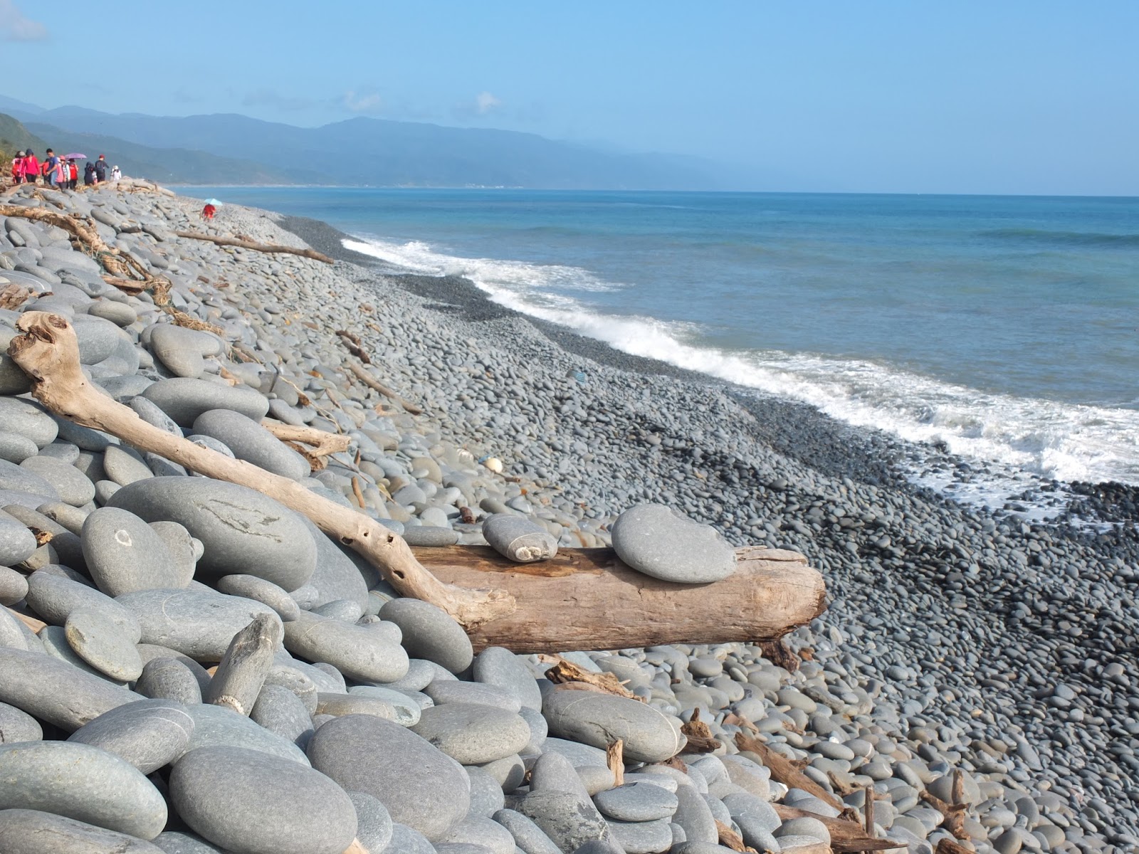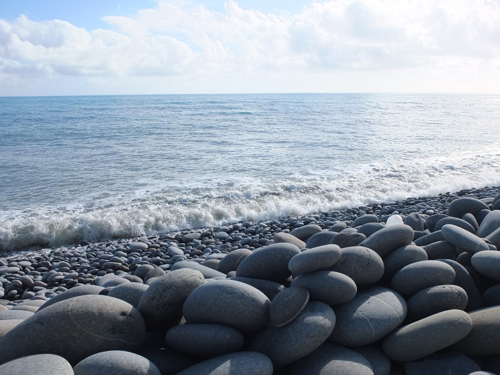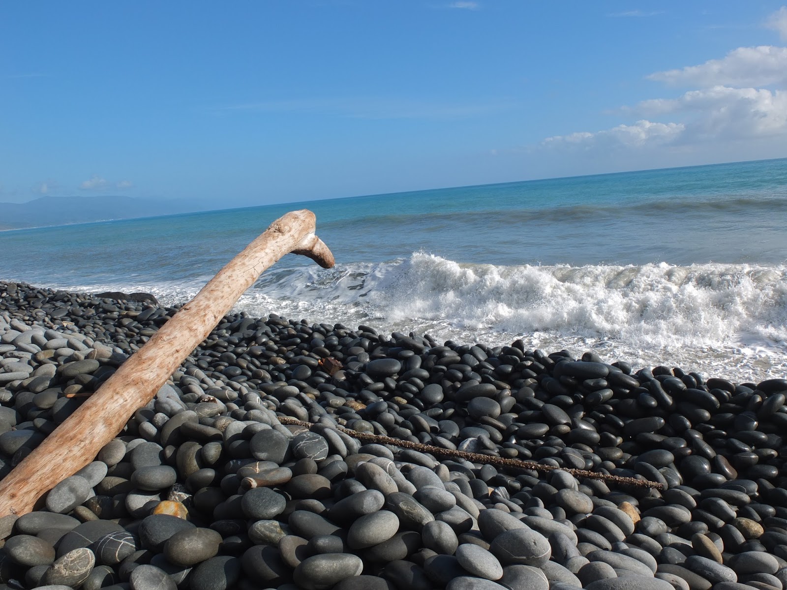 就是這個石!在其他人網誌的照片上看到的,就是這個石!海岸邊佈滿了大大小小的南田石,個個圓潤扁平,數大美感渾然生成。走這南田石海岸,要在腳下這顆石子晃動之前,就趕緊跳往一個落腳點。一路這樣蹦蹦跳跳,好似在玩跳石頭遊戲。一旁太平洋的浪潮,將岸邊南田石捲入海中、再沖回岸上,石子滾動撞擊著,發出轟隆隆地、特別響亮的加油聲,與一般沙礫海灘的浪潮聲不同,是另類「響」宴。