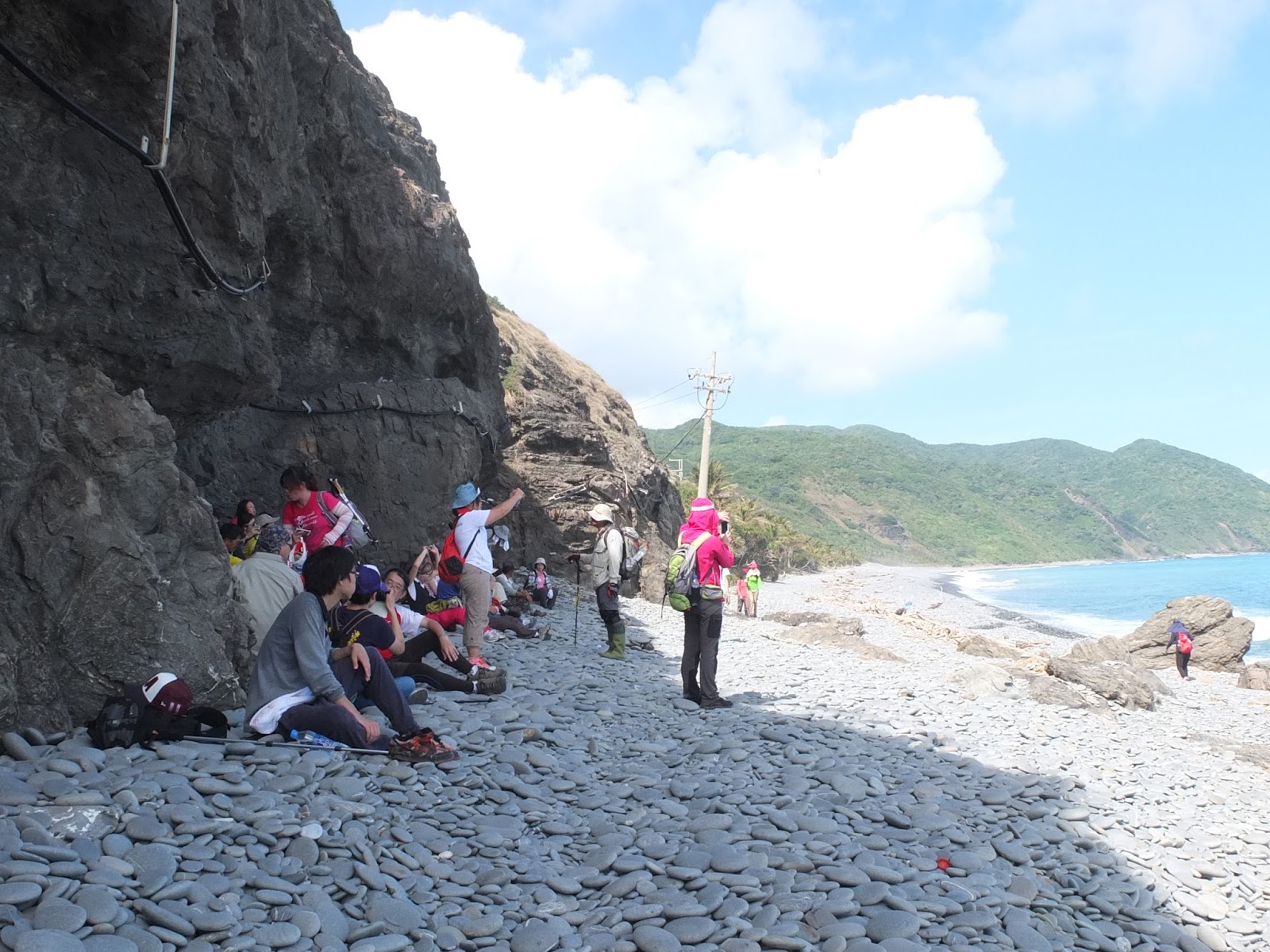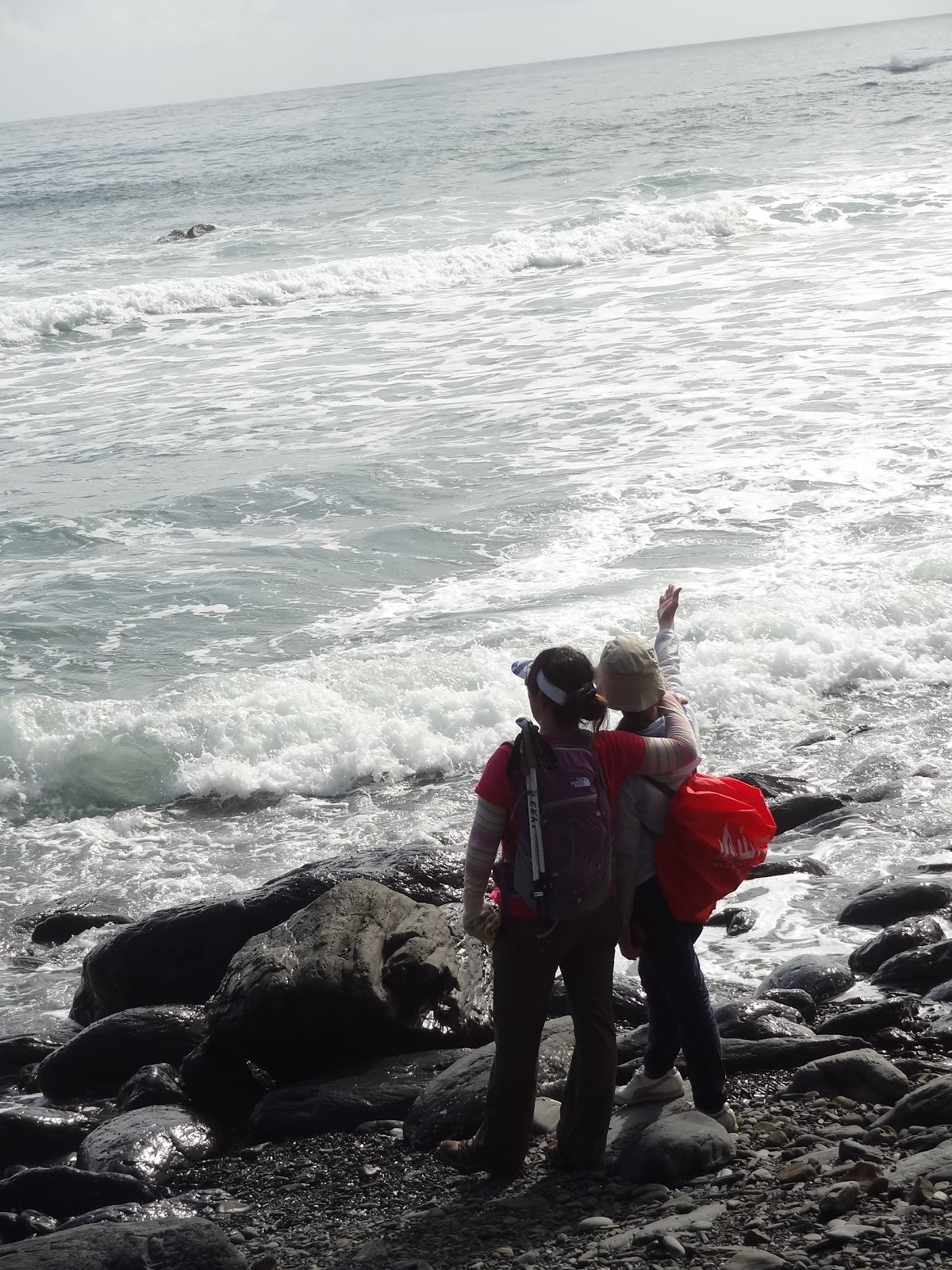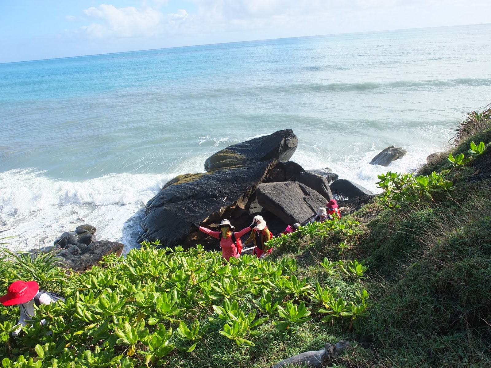 抵達一片樹林後,兩隊都在這落腳午餐休息。時間為早上10點多,嚴格說來,應該稱為早午餐。穿越樹林後,又走回海岸。當然要來個風情萬種的海邊團體照囉~