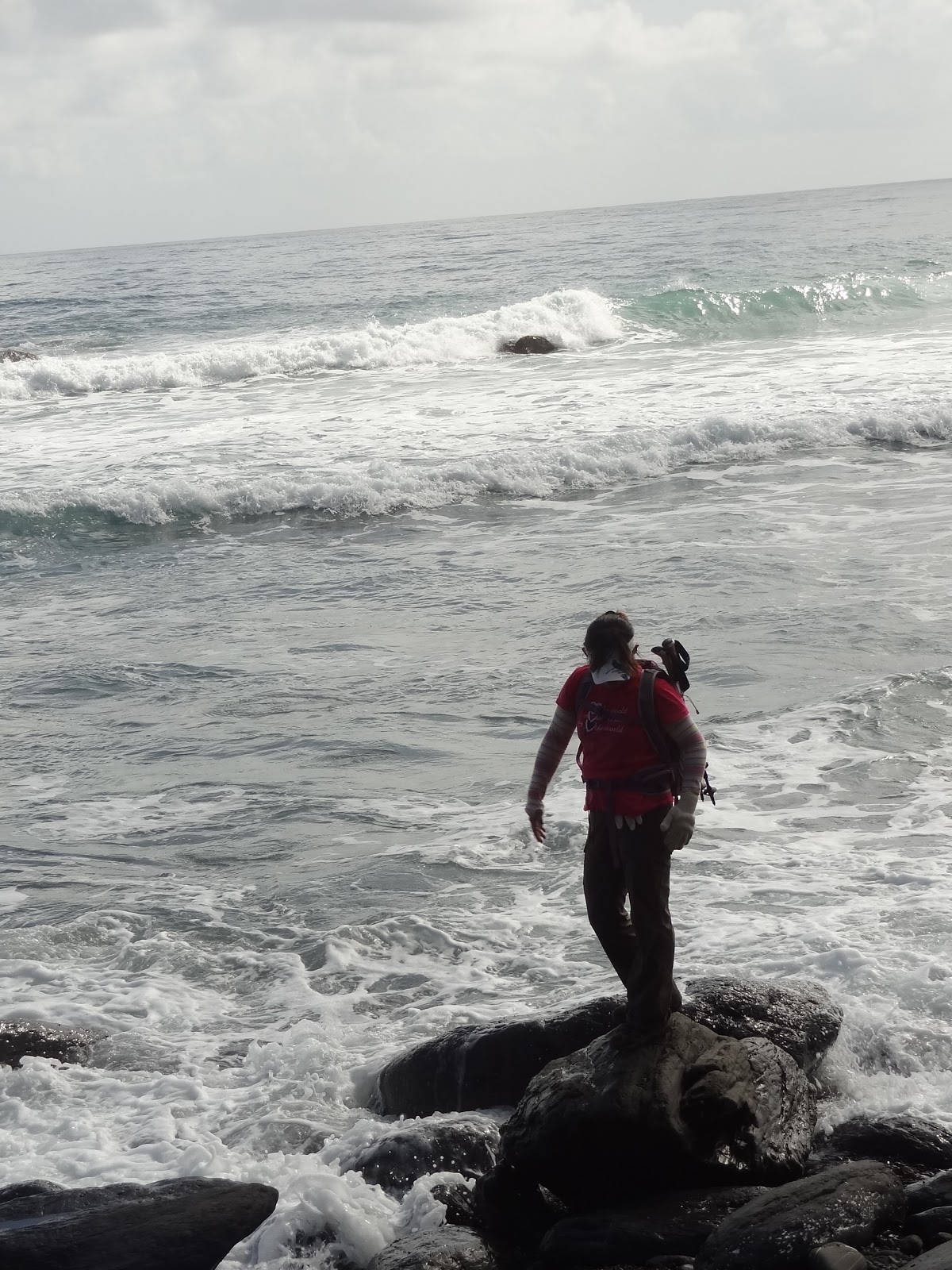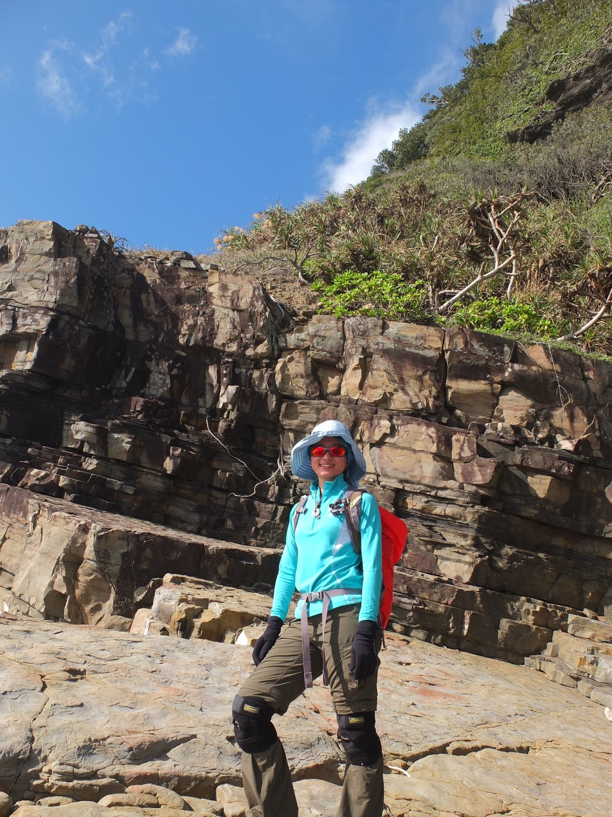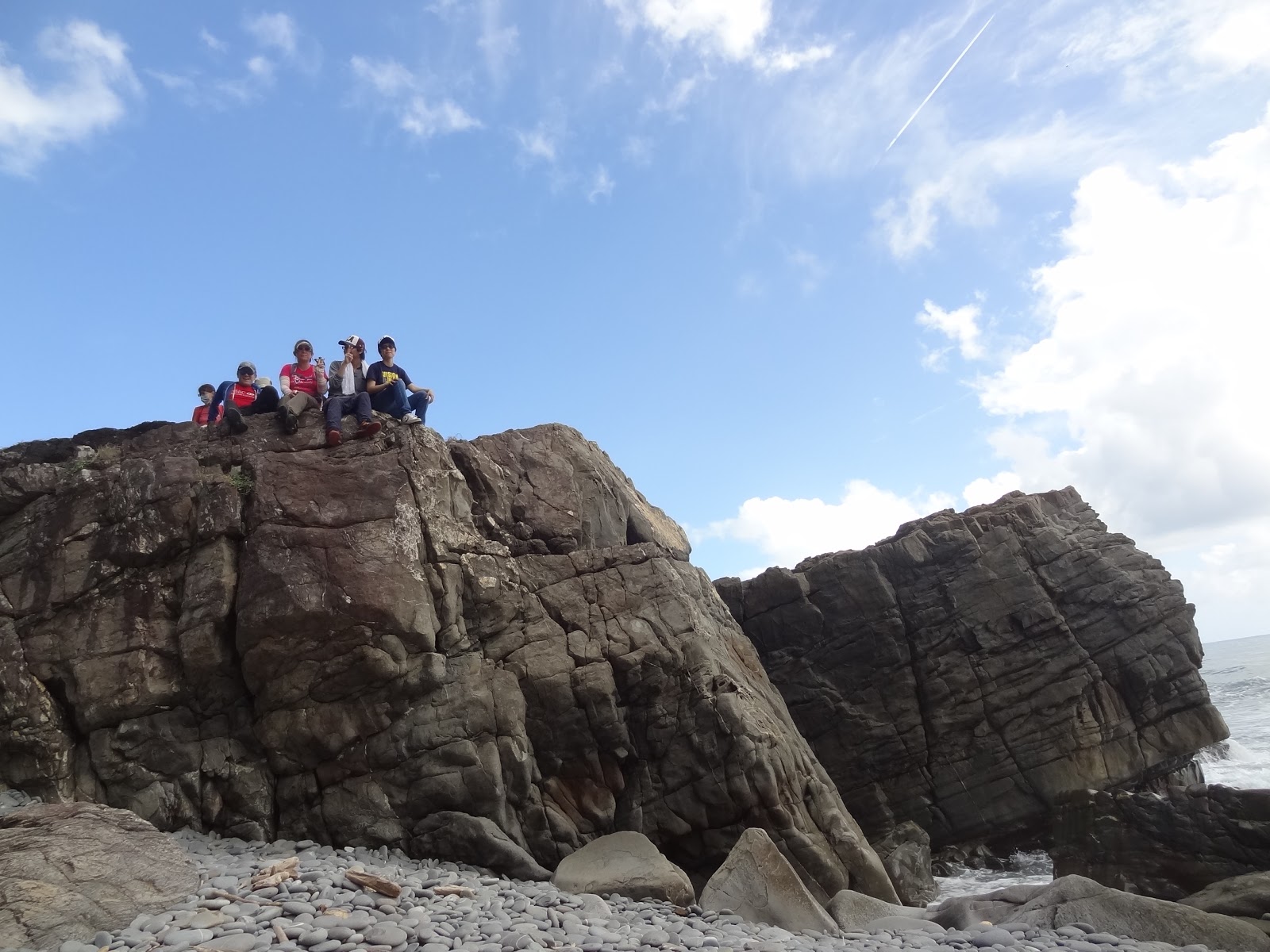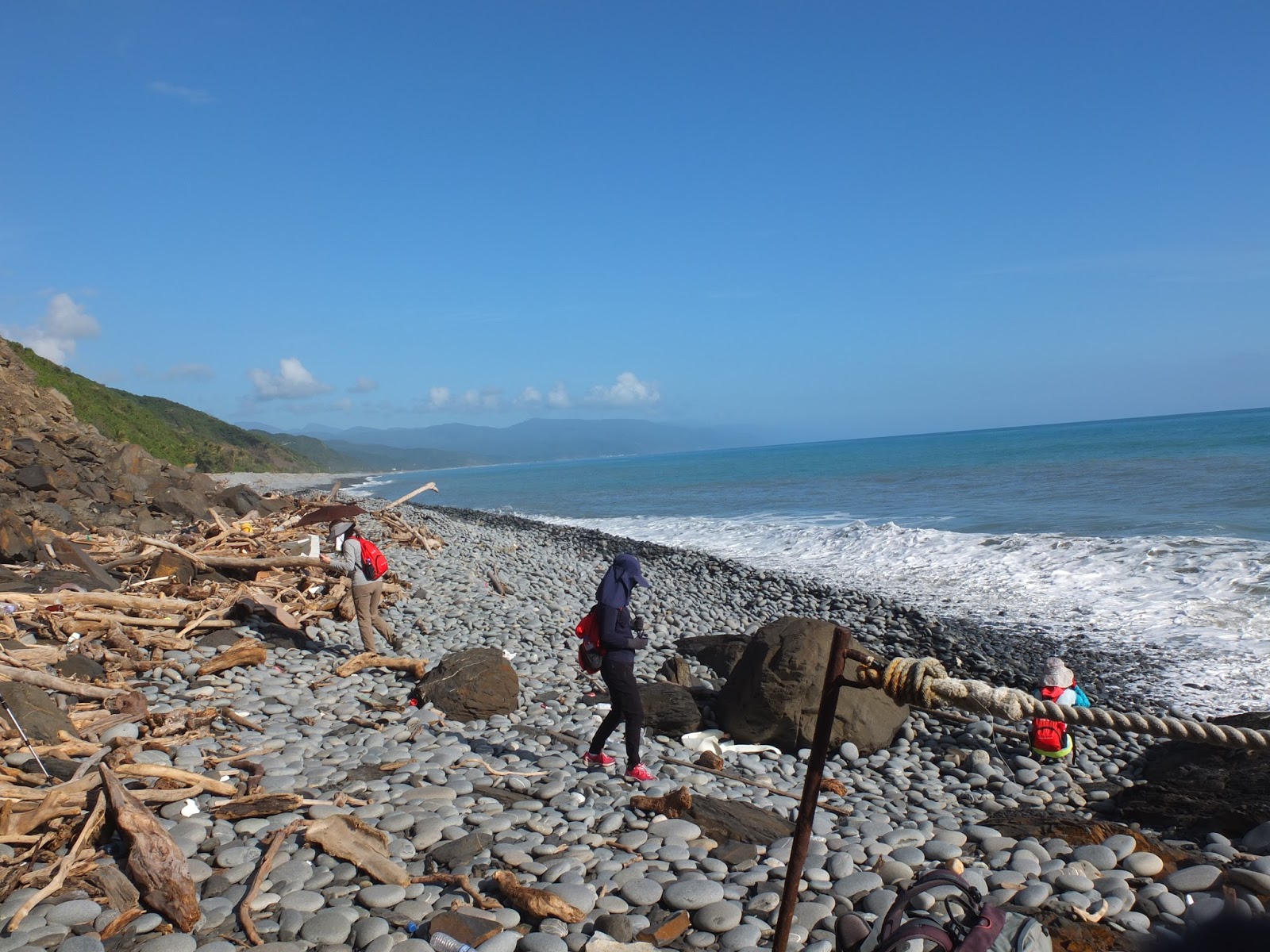抵達一片樹林後,兩隊都在這落腳午餐休息。時間為早上10點多,嚴格說來,應該稱為早午餐。穿越樹林後,又走回海岸。當然要來個風情萬種的海邊團體照囉~
