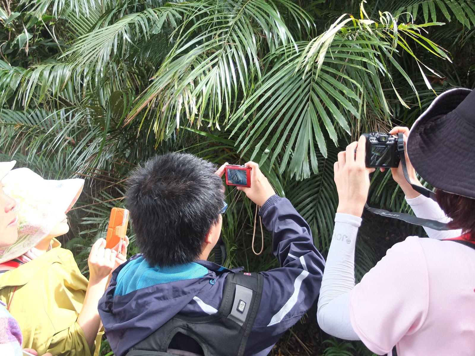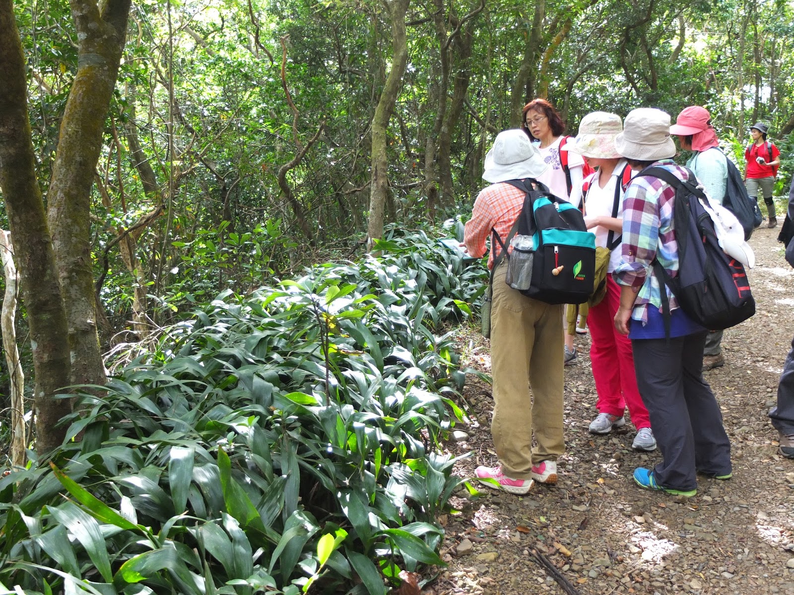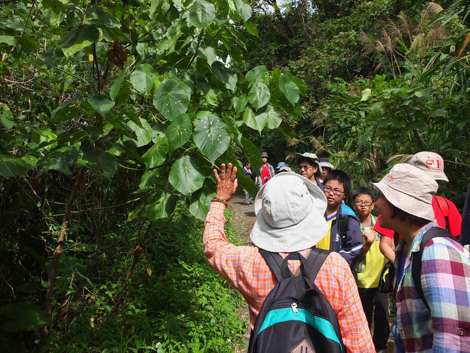 看完後分兩隊,由二位解說員各帶一隊,踏上南仁湖生態之旅。大家今天都是來小外教學的認真學生。解說大姐帶我們認識了棋盤腳、台灣及己、大笨蝶、青山蝸牛、大果榕、冷清 草等。同隊的小朋友觀察力很敏銳,一路發現螃蟹和蝸牛等生物。