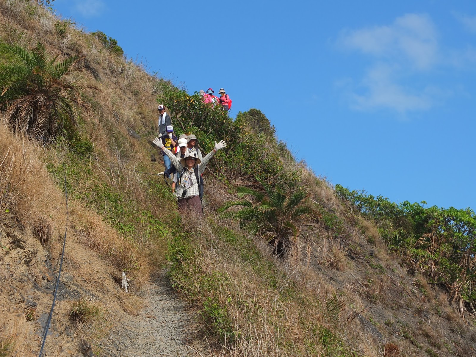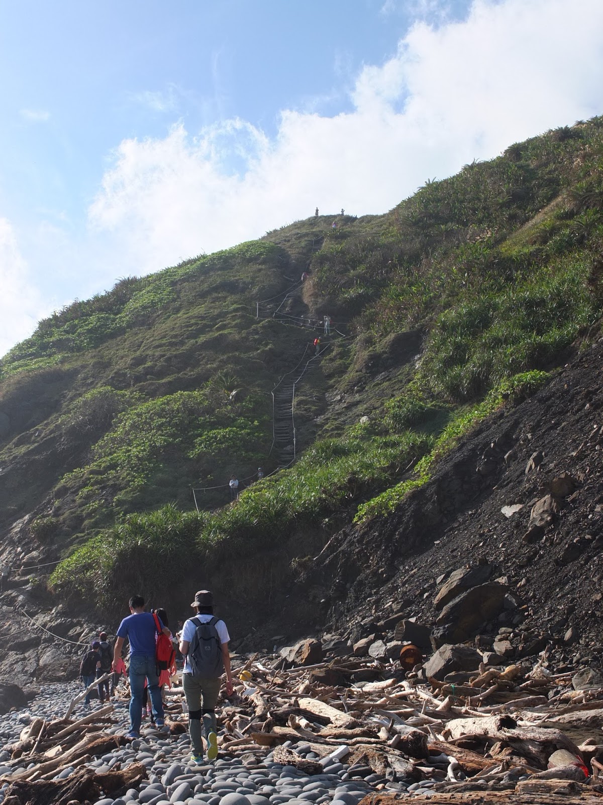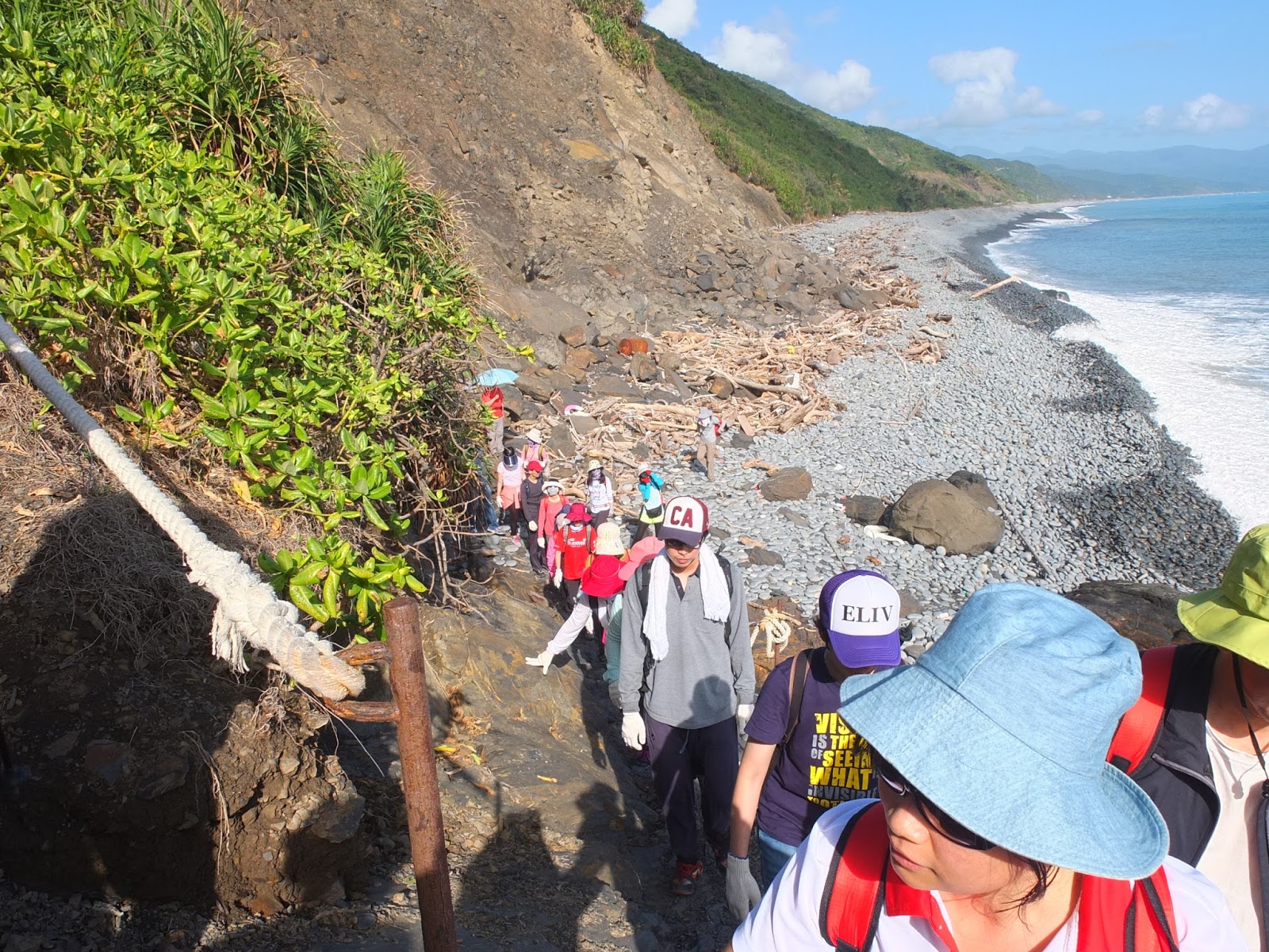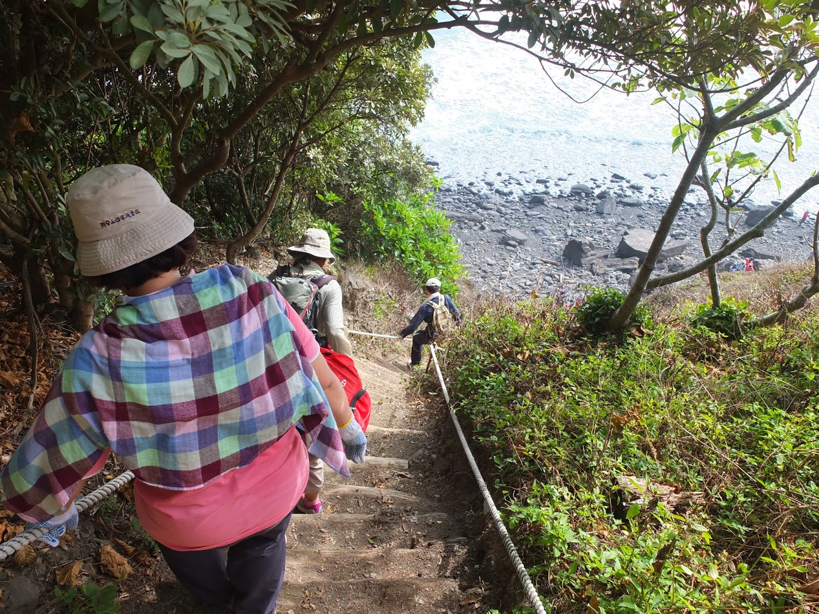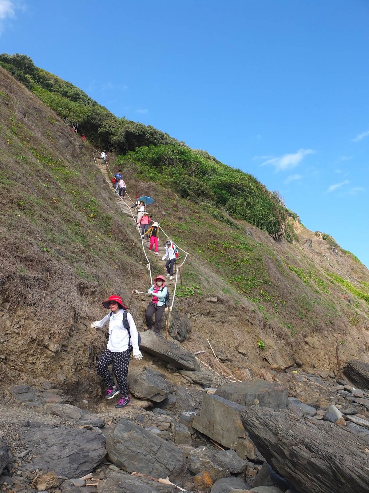 有段古道已被海水淹沒,要往斷崖上爬,改走一段林間小徑。部分階距較高,這時候就需要攀拉一旁的繩索,大夥拿出手套、手腳並用爬上山崖。