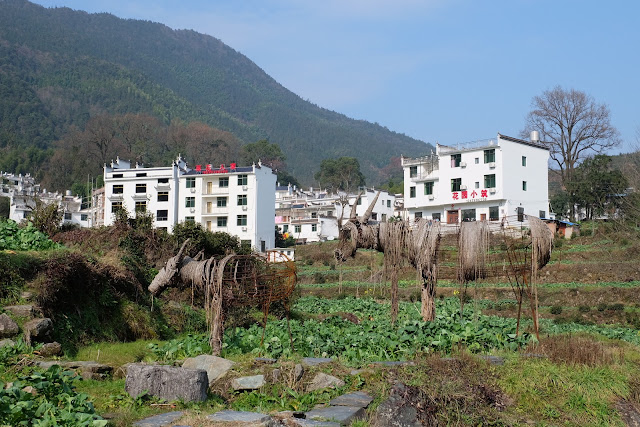 離開延村的時候,看到一個景象,也是讓我們放棄思溪村的原因。我們看到延村蓋了一些新的古式樓房要做旅館用,新刷的白牆在古建築中顯得突兀,因此工人還拿著油漆刷特意在潔白的新牆上,鋪上淡墨般的斑點痕跡,試圖讓這個新樓房融入古建築的老韻中。
