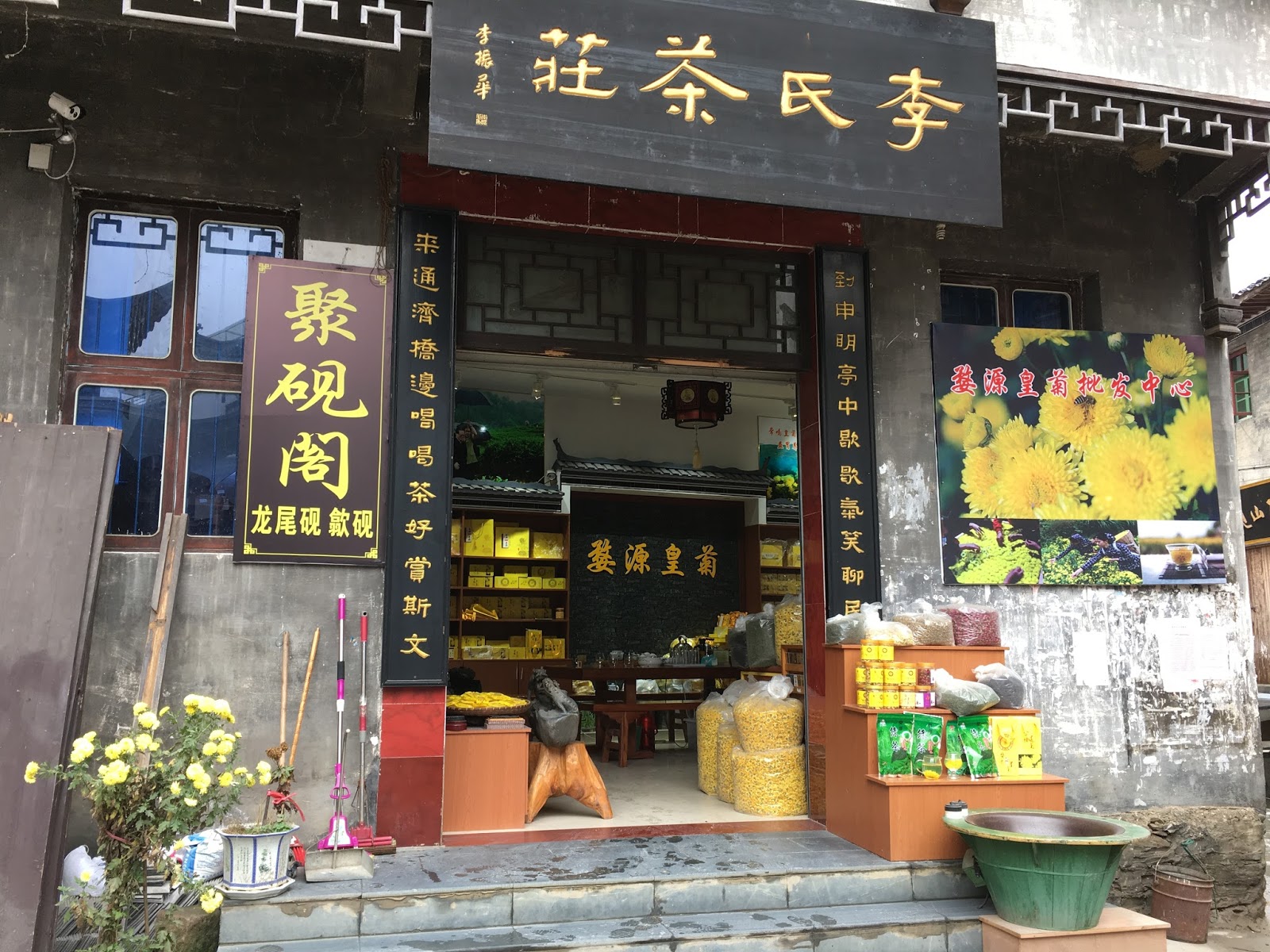 繼續往村子中心走。這裡是古代商業貿易區,小橋特別拱起,是船隻都可以經過的流水道路,兩岸都是商店,看起來曾經繁華一時。目前現存的商店,除了飯館和民宿之外,就是茶館,專賣風乾的菊花。