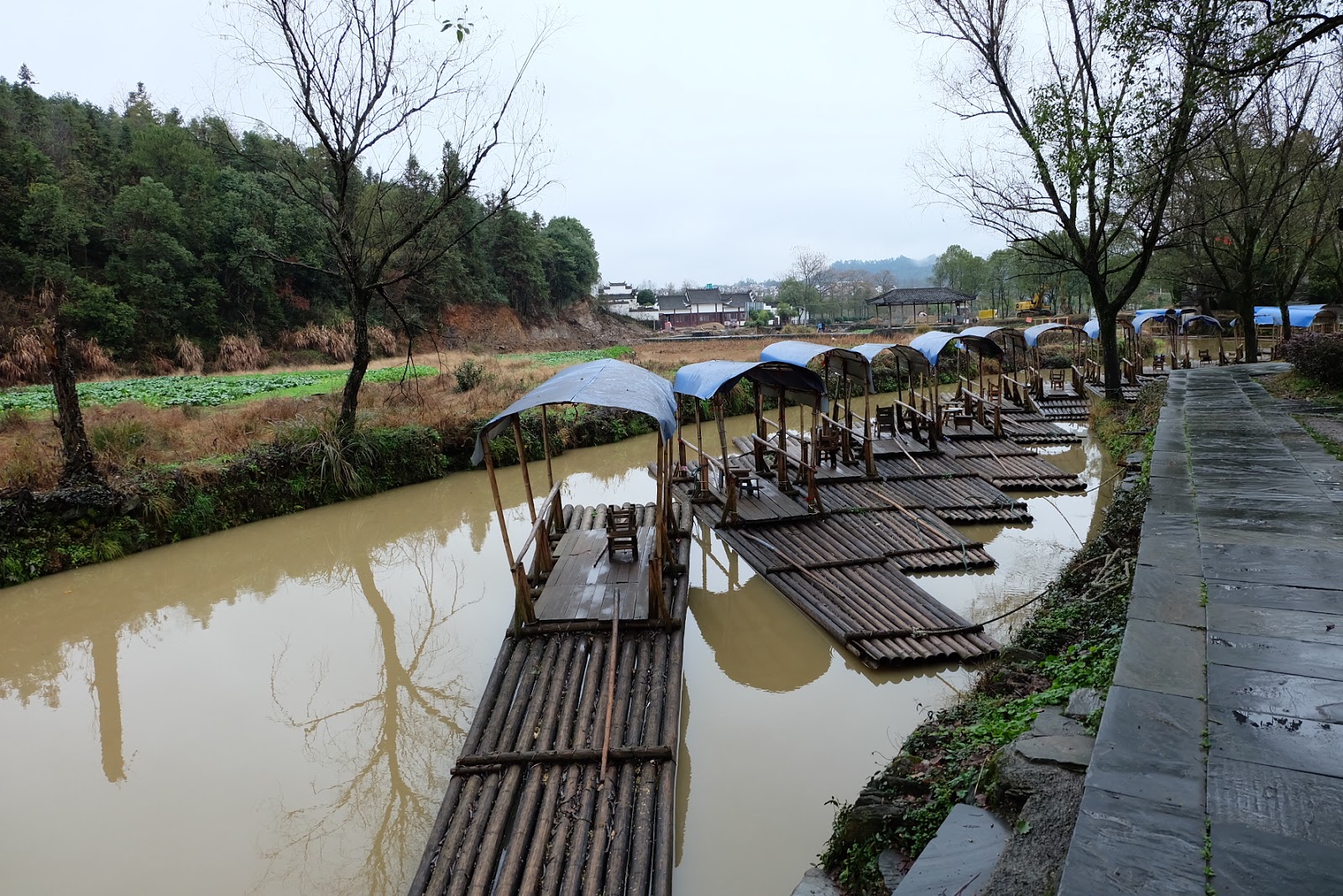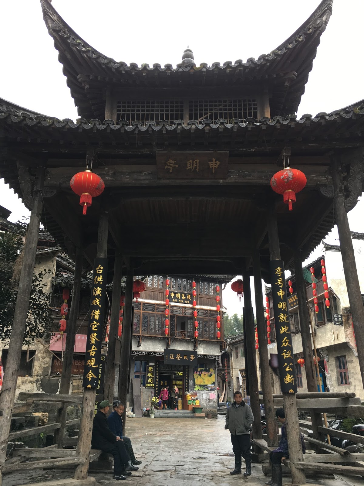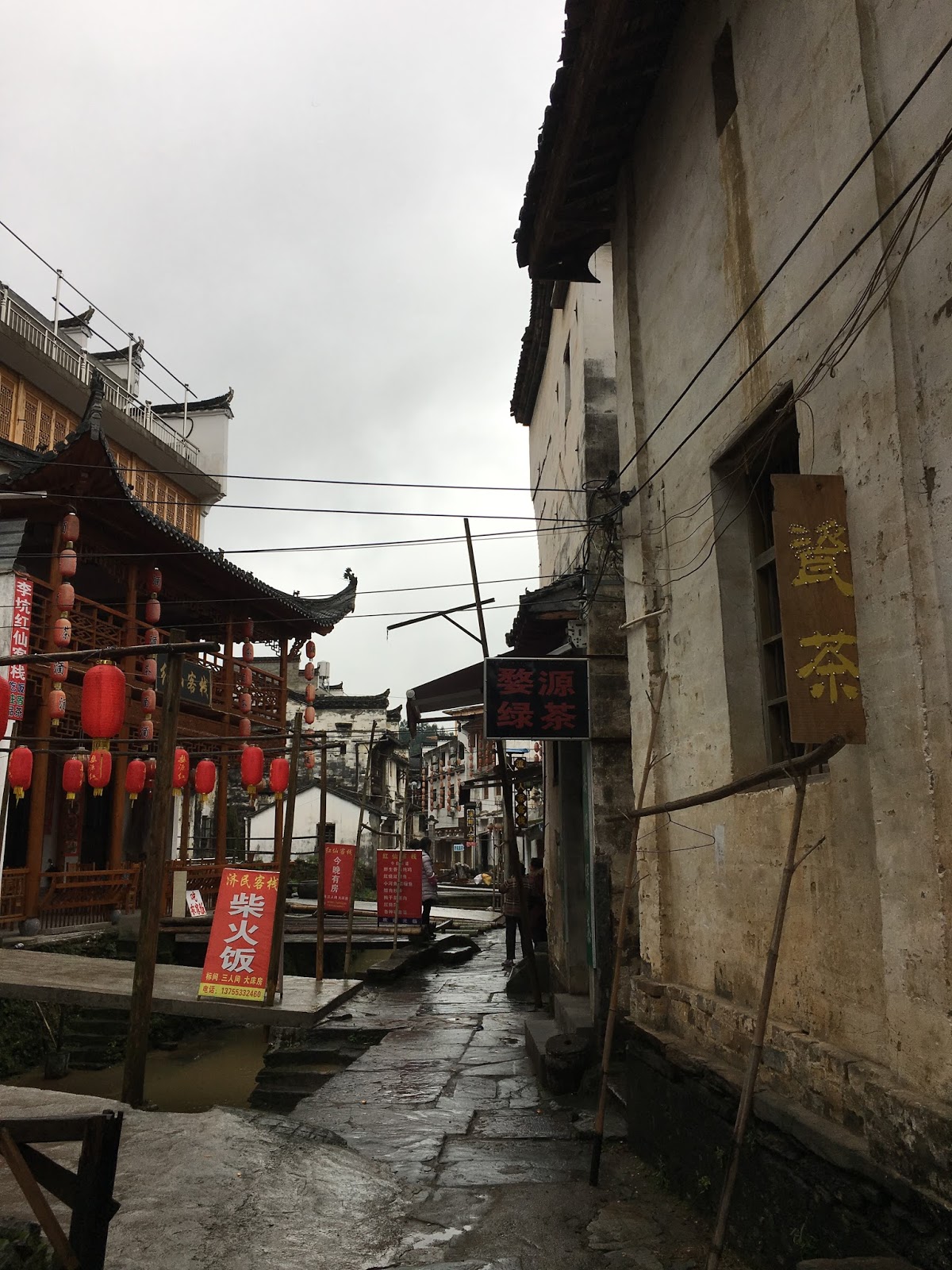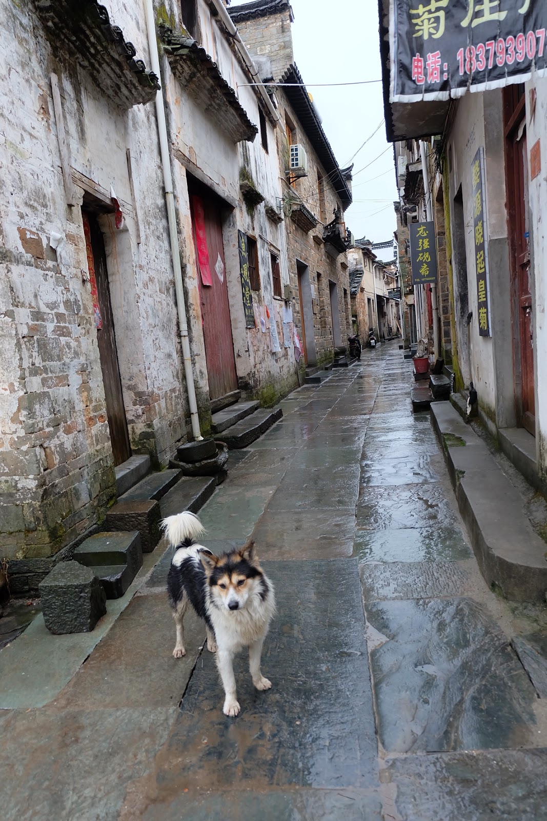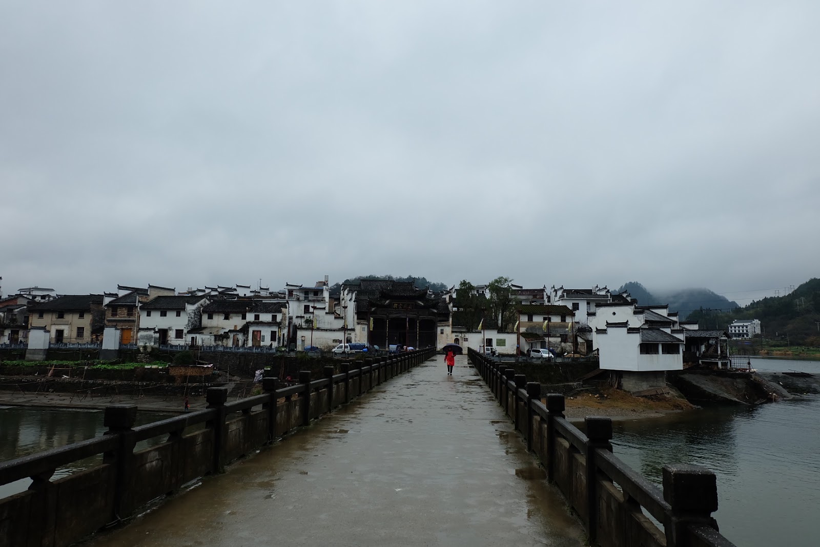 我們離開李坑後,開車約三十分鐘後抵達汪口。在門票口驗證了指紋之後,走進這個建立在河流彎處的村莊。這時候天空終於暫時停止飄雨,地上的石磚都濕漉漉的,旅客相當稀少,門票口的守門員都冷得直打囉嗦,裹著厚棉被打瞌睡。