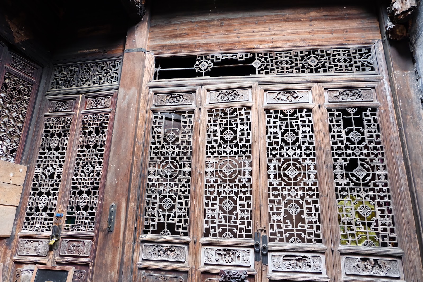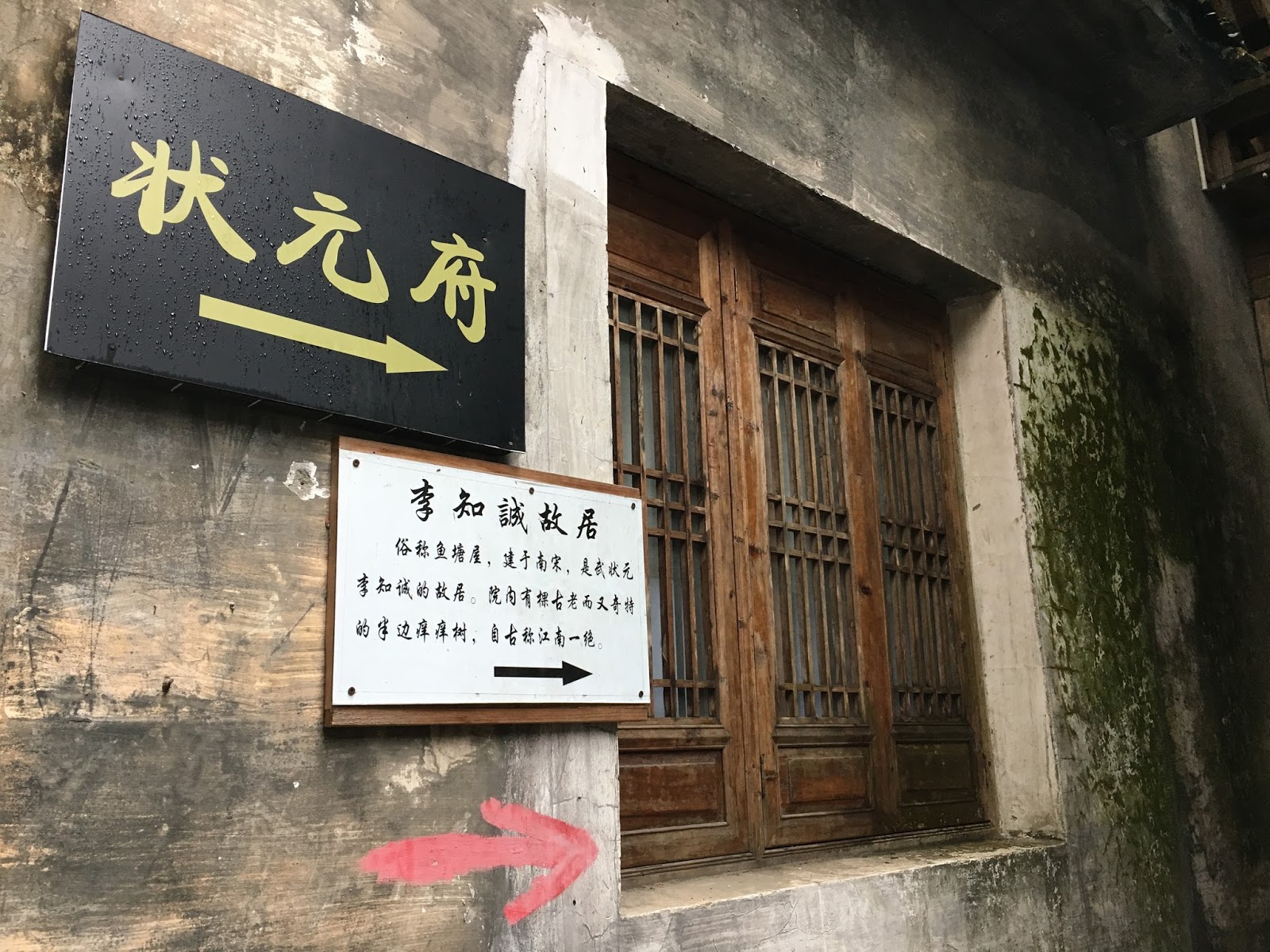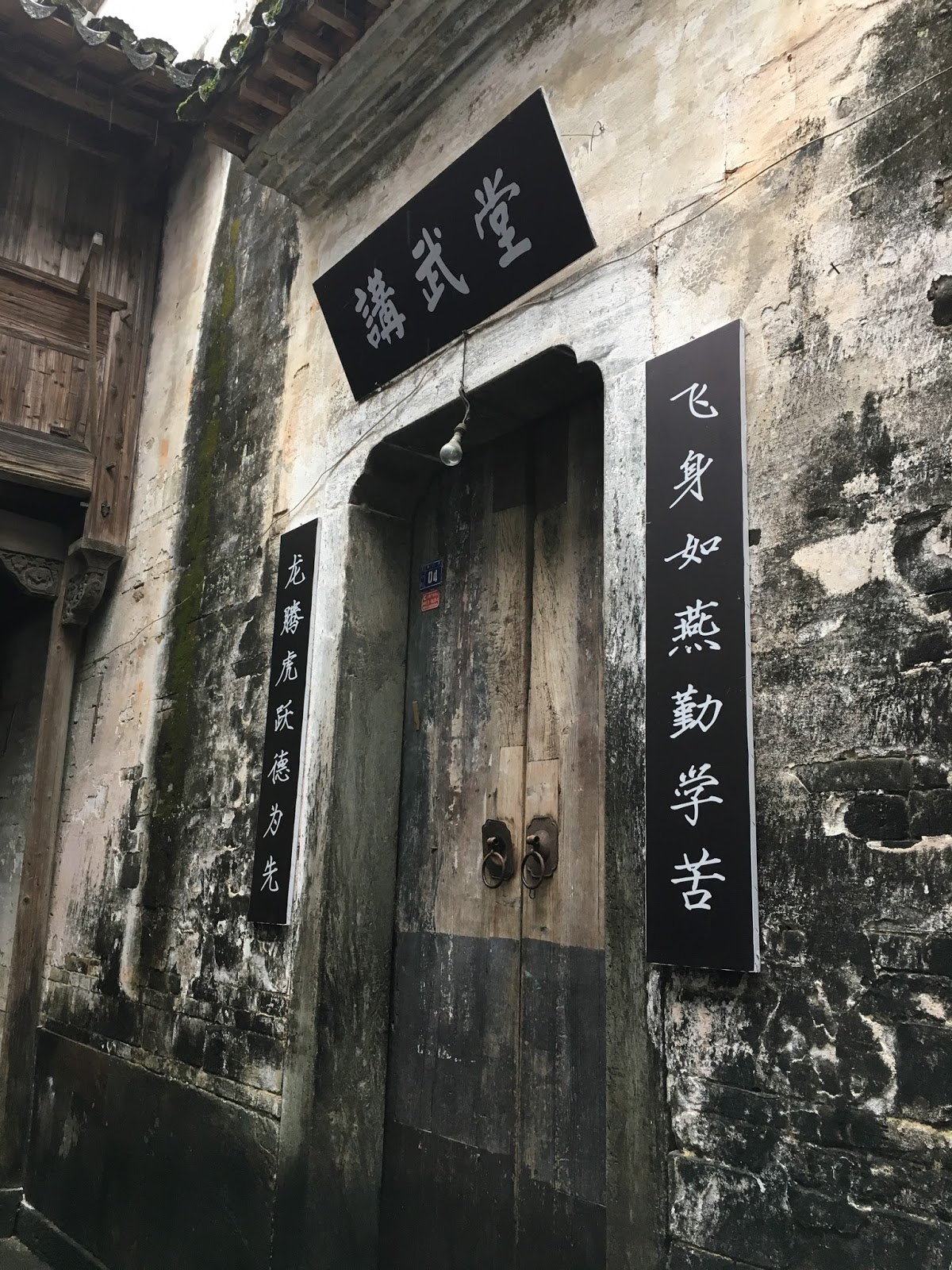 這個大夫第的門很講究,一下子就吸住我的目光。這是徽式建築的大門,大門上有立體凸出屋簷與簷角裝飾,在門與屋簷之間,有精美的磚雕。從大門右上方脫落的磚雕來看,這房子是磚頭砌成,塗上水泥之後,在貼上磚雕,「裝飾門面」。就像女孩子化妝一樣,眉毛要修剪,眉髮不夠濃還要上青黛。門上方的屋簷兩側,有黑色乾墨般的痕跡,看來是雨水打到黑磚屋瓦上,然後順著水勢往兩側留下,長年之後,就是這般風味。像在鄉野間邊耕作邊吟詩的退影居士,古樸中活出一番瀟灑。