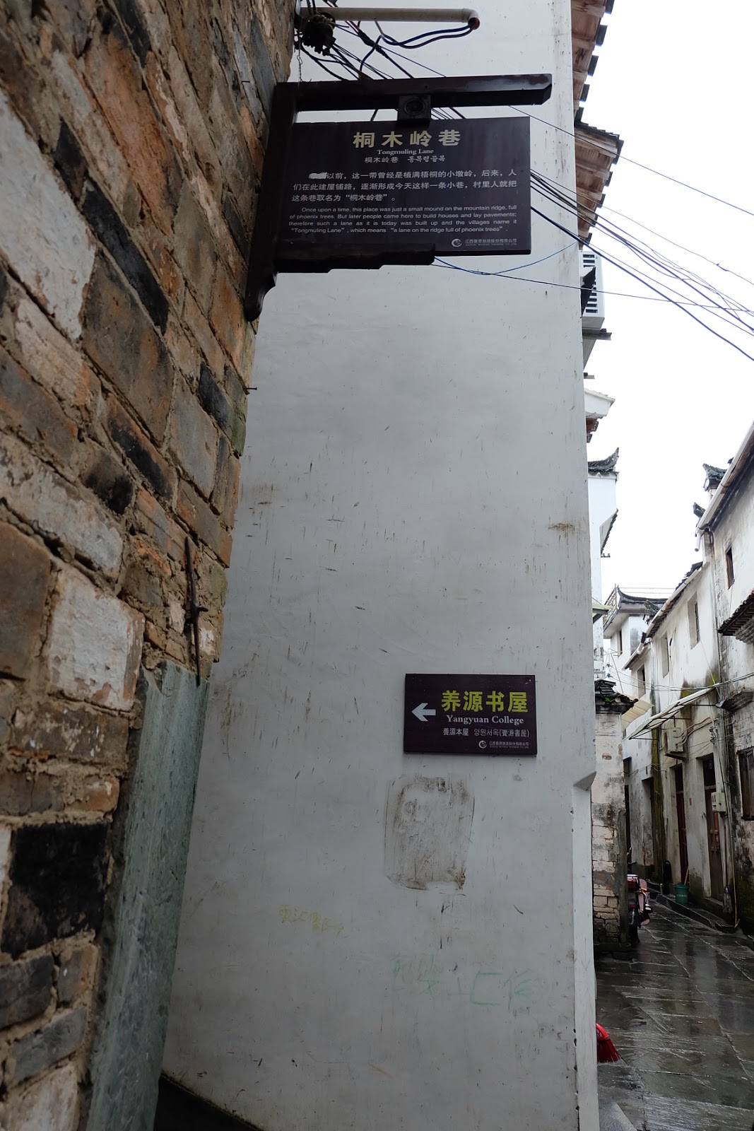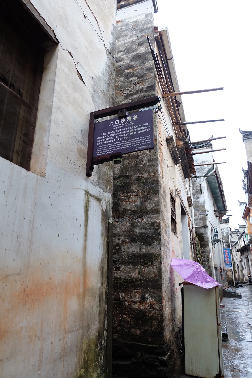 沿著河流走進汪口這個村,一個又一個巷子,垂直於江灣河而各有特色。村子的觀光標誌,依著每條垂直於江灣河的巷子,說起一個又一個故事。