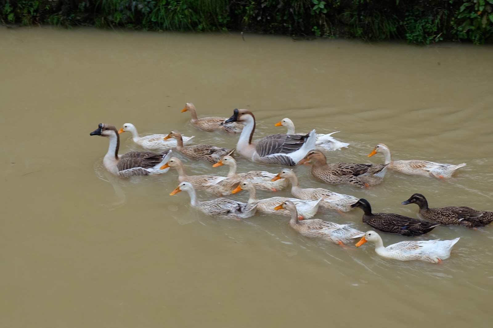 走出李坑,天空又下起小雨,我們快步離開,結束了第一個婺源之景。回程的路上,看到小鴨鴨們與鴨媽媽一起悠游的景象,有趣許多。有一隻小鴨子在菜田旁站著,看著媽媽與兄弟姊妹們在水中游得好快樂,想要跳下去又不敢跳,最終勇敢地一蹦,加入大家的行列,快樂地游著。