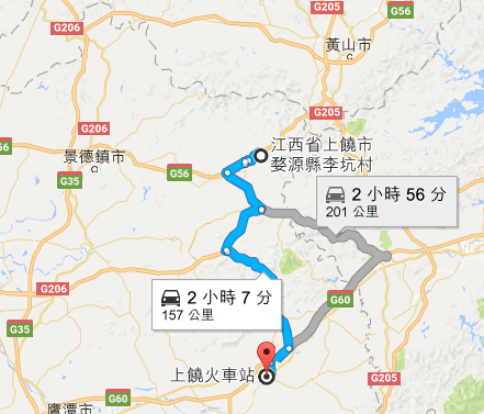 我們坐動車抵達上饒這個城市,再從上饒前往婺源李坑。看看地圖,右上角是曾經去過的黃山,左邊是還沒去卻久仰大名的景德鎮,這裡好山好水好文化,沒做功課就到婺源來,還真不知道接下來的旅行,會長甚麼樣子。