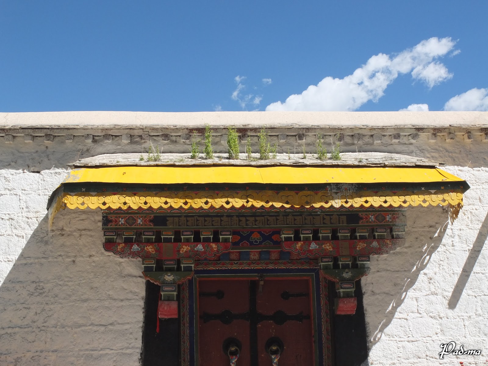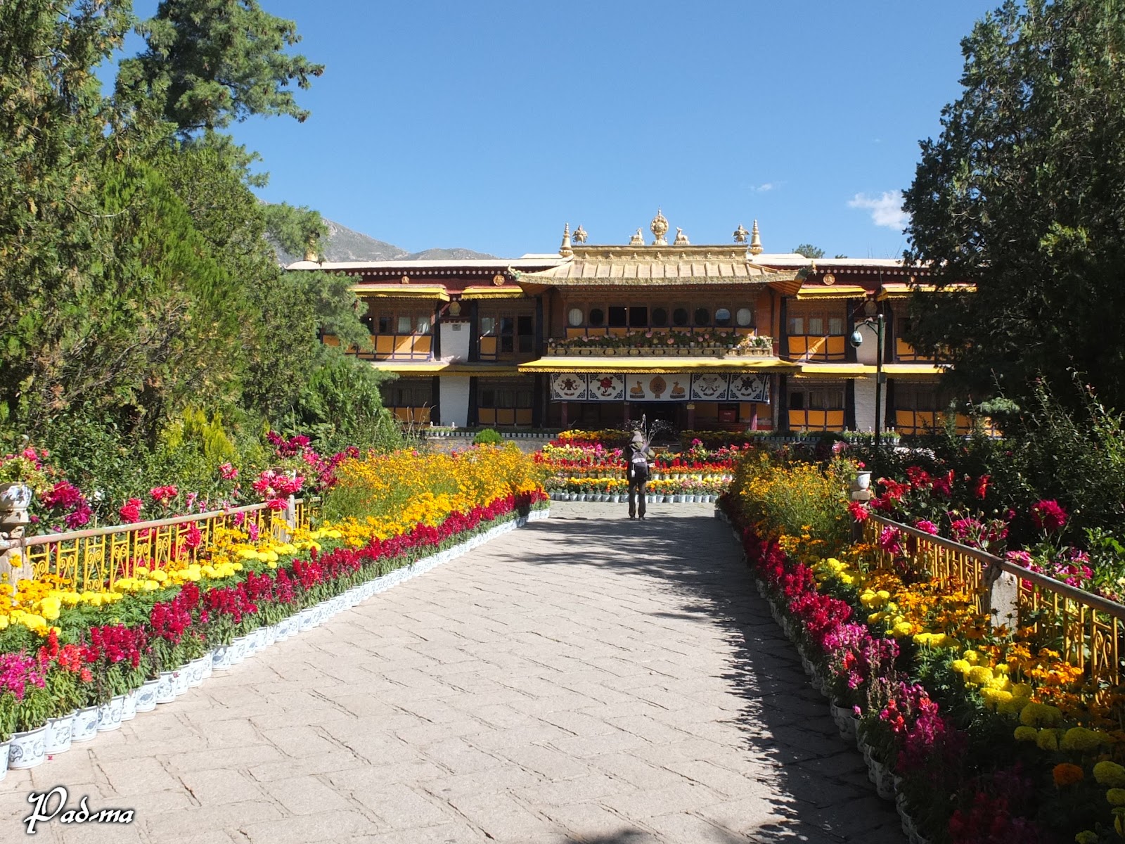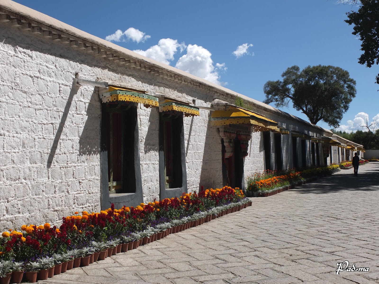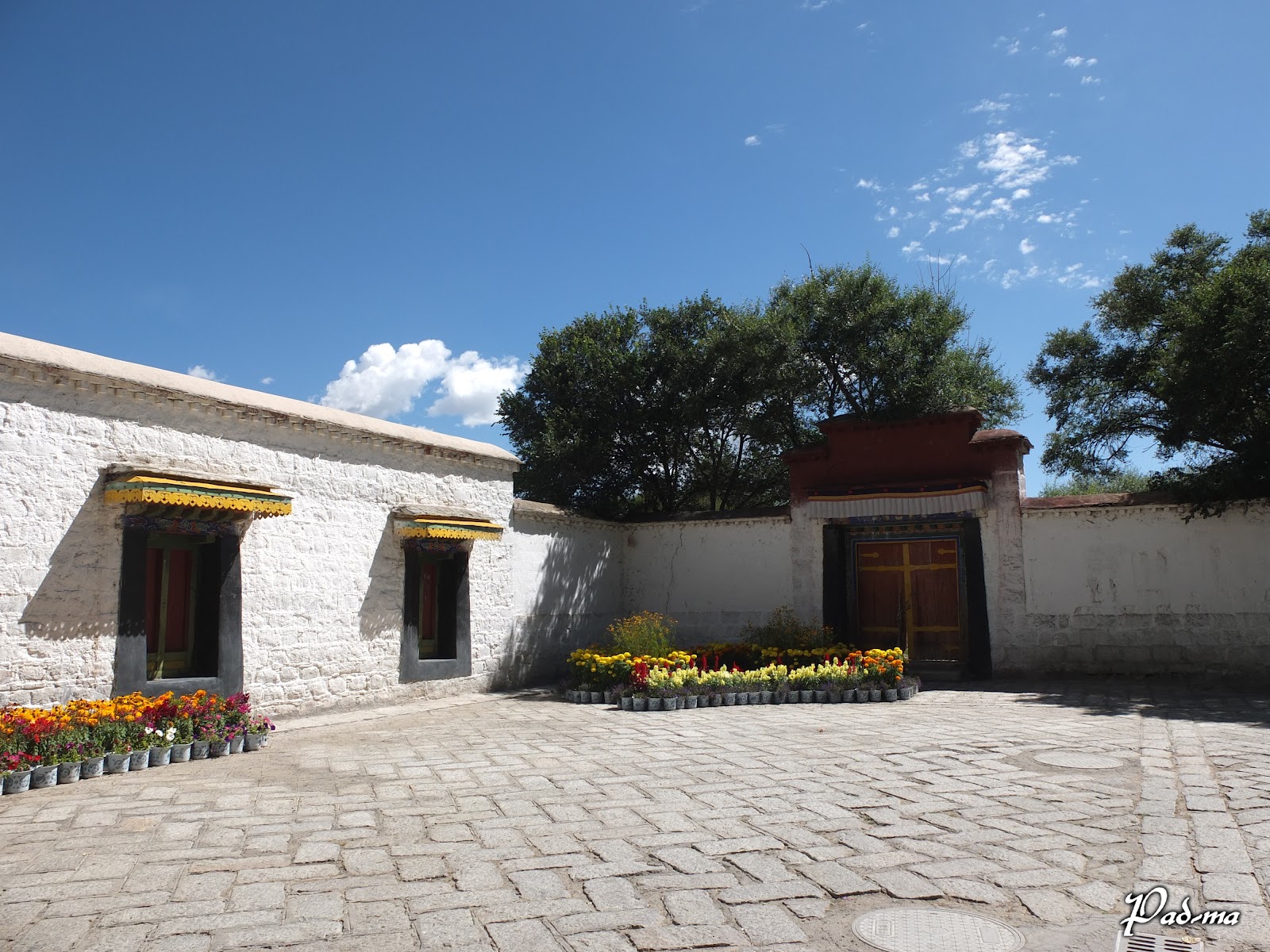 主殿旁有花園涼亭,在小道上行走悠然自得。一旁的房舍刷著白色的漆,在藍天白雲和綠樹的襯托下,格外耀眼迷人。窗櫺和門框上掛著彩色的幡簾,在微風中飄揚起舞,煞是好看。對貝瑪來說,西藏最美的幾個時刻,有幾幕就在這裡。