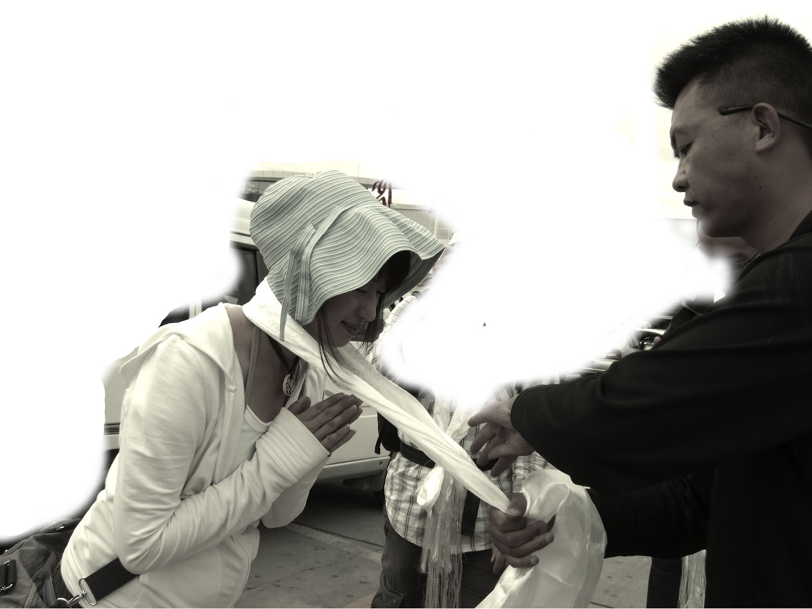 出了機場之後,藏人導遊多吉為每個賓客掛上白色哈達,一條白色的長絲綢,口中唸著” 札西德勒”,歡迎賓客。